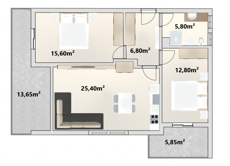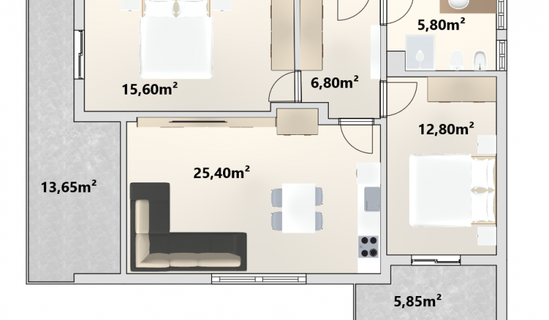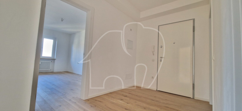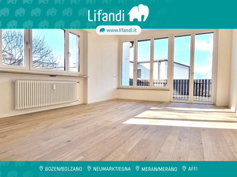 L’appartamento è composto da un atrio, due spaziose camere da letto, di cui una con balcone privato, un bagno finestrato e un luminoso openspace con ampia vetrata, dal quale si accede a un secondo balcone di circa 13,5 m². Da qui si gode di una splendida vista aperta sulle montagne e sulla città di Bolzano.