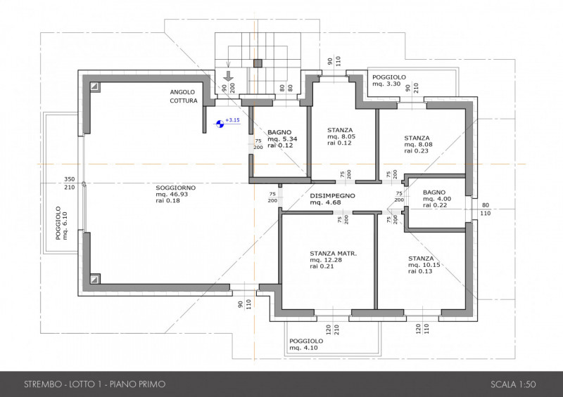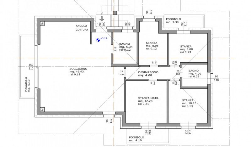 L’attuale progetto prevede un’ampia zona giorno con soggiorno e angolo cottura, servita da un balcone panoramico. La zona notte è composta da quattro stanze da letto, due bagni finestrati e due ulteriori balconi, offrendo ampi spazi per famiglie o per chi desidera ambienti versatili e confortevoli.