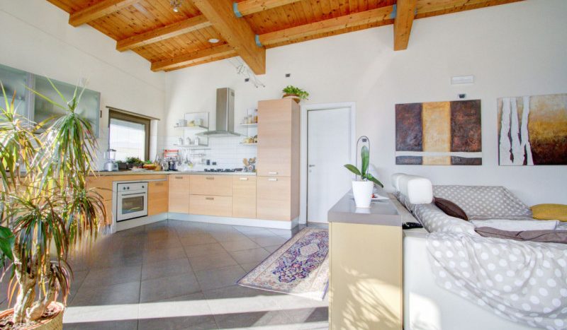 L’ingresso si apre su una luminosa zona living con grandi finestre a tutta altezza che inondano l’ambiente di luce naturale e incorniciano un panorama mozzafiato. L’area giorno, impreziosita da eleganti travi in legno a vista, ospita il soggiorno, la cucina a vista e un primo bagno finestrato. Da qui si accede a un balcone esposto a sud-ovest, ideale per godersi tramonti e momenti di relax all’aria aperta. Proseguendo, l’abitazione si sviluppa con due percorsi distinti: dalla cucina si accede a una stanza attualmente utilizzata come studio, con uscita su un secondo balcone esposto a nord; dal soggiorno invece si raggiunge la zona notte, composta da una camera singola con accesso allo stesso terrazzo, una spaziosa camera matrimoniale con cabina armadio e un ampio bagno finestrato, con finestra ricavata nella falda del tetto.