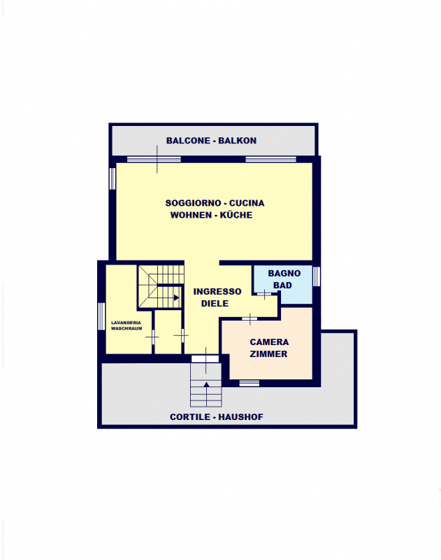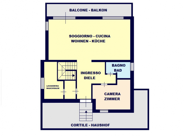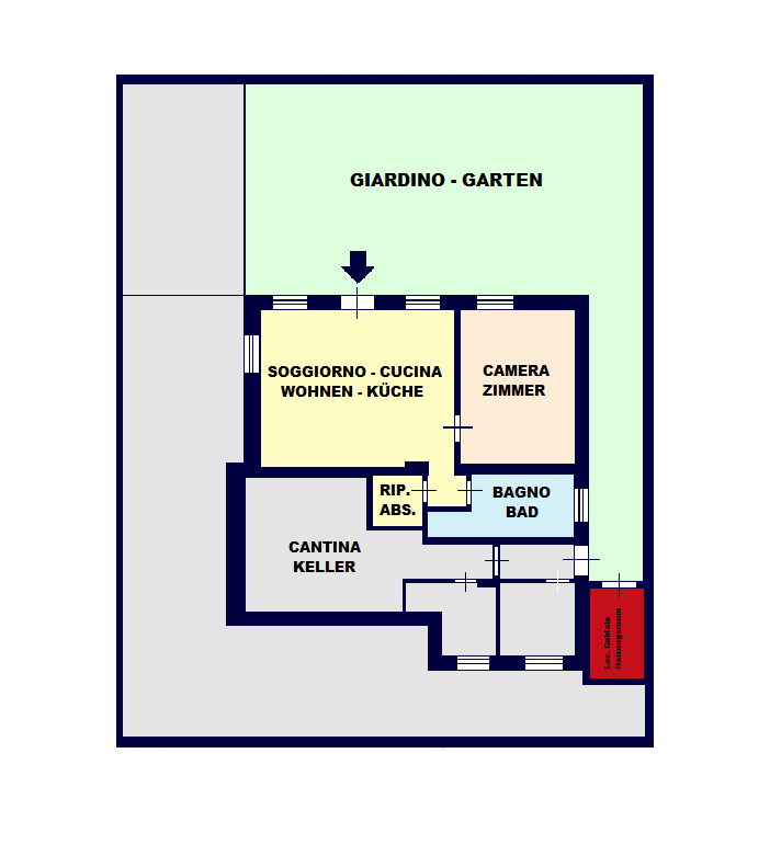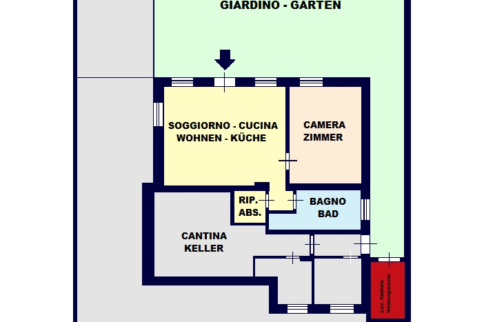 L’unita immobiliare al piano inferiore troviamo un moderno bilocale di grandi dimensioni con affaccio sul giardino cosi disposto: