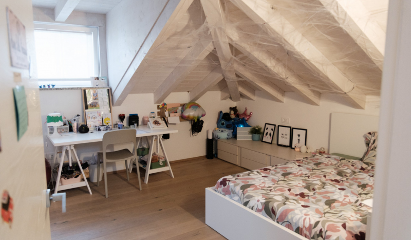 Im Obergeschoss befindet sich eine Wohnung, die sich über zwei Etagen erstreckt und viel Platz bietet: