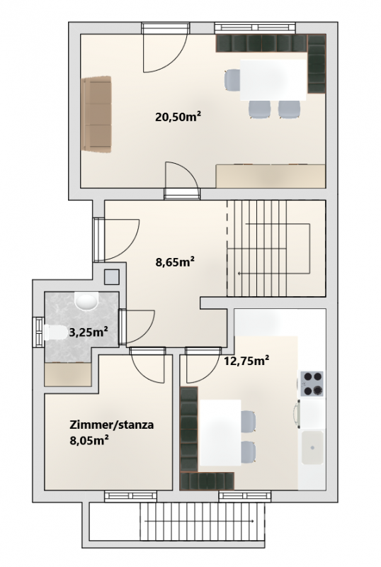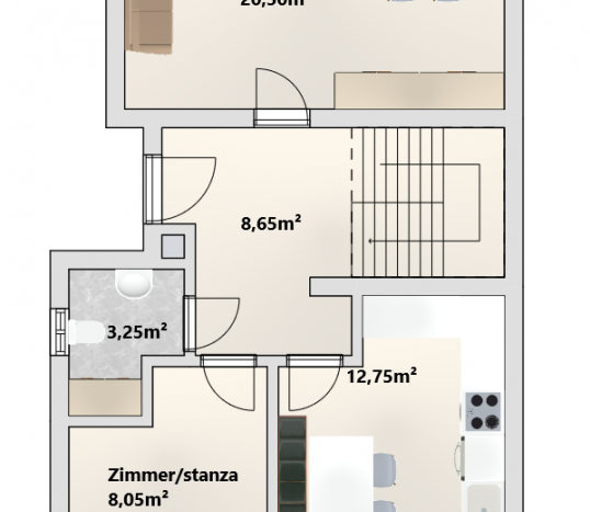 L’immobile è composto da quattro camere da letto, una cucina, un soggiorno, 2 bagni con finestra e un WC. Due balconi e un ampio giardino offrono un piacevole rifugio e invitano al relax.