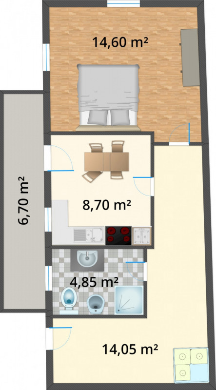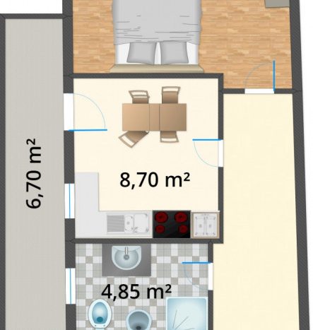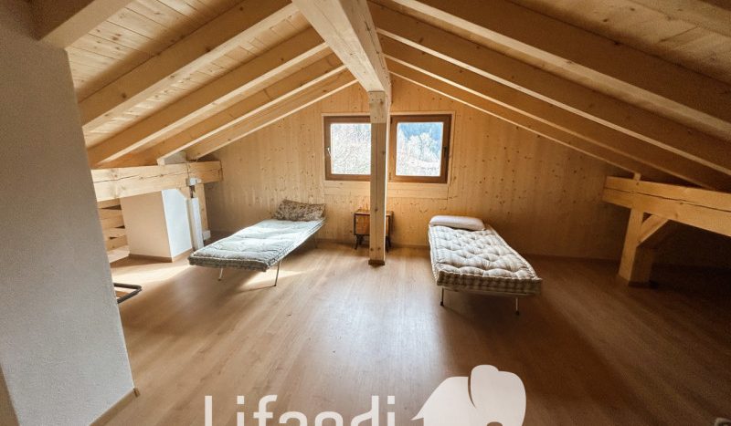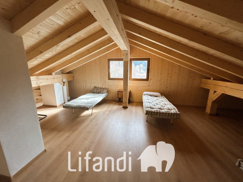 Das Haus erstreckt sich über drei Etagen: im Erdgeschoss befinden sich zwei Kellerräume und ein Autoabstellplatz; im ersten Stock eine zu renovierende Zweizimmerwohnung; und im zweiten Stock eine im Jahr 2019 renovierte Wohnung, bestehend aus einem Zimmer, einer Wohnküche, einem Badezimmer und einem Zwischengeschoss, das als zusätzlicher Raum genutzt werden kann.