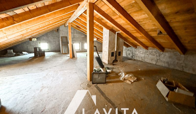 Nel seminterrato si trovano tre cantine e un doppio garage con accesso diretto alla casa. Il piano terra comprende un ingresso, una cucina, un soggiorno con accesso diretto al grande giardino che circonda l’abitazione, un bagno e un ripostiglio. Al primo piano sono disponibili quattro ulteriori camere da letto, un disimpegno, un bagno e una soleggiata terrazza. La mansarda, al piano superiore, è ampliabile e offre ulteriore spazio per idee abitative personalizzate.