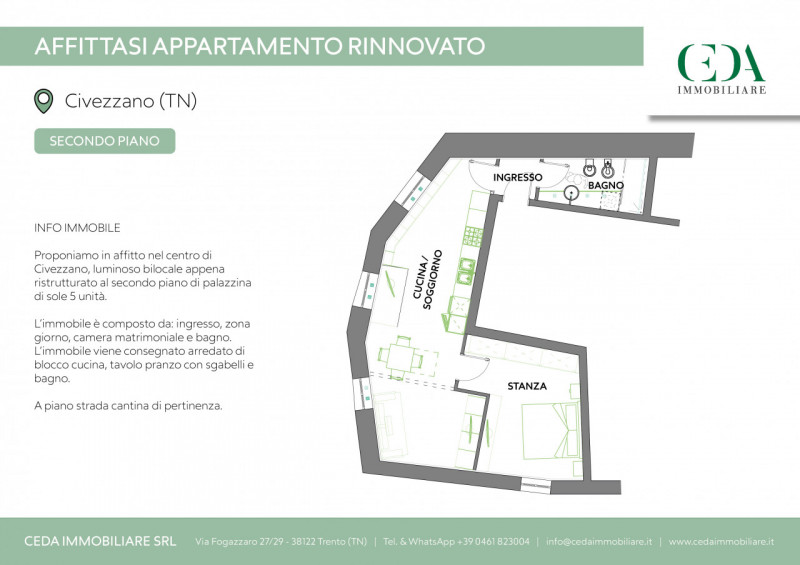 Proponiamo in affitto nel centro di Civezzano, luminoso bilocale appena ristrutturato al secondo piano di palazzina di sole 5 unità.