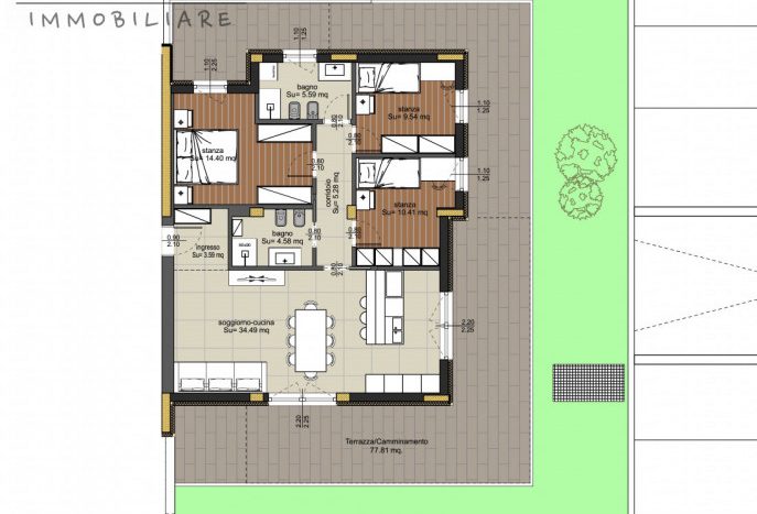 CLARINA – In nuova costruzione di classe energetica A + vendiamo appartamento sito al piano terra con ampio giardino, composto da: ingresso, soggiorno con angolo cottura, tre stanze da letto, disbrigo e due bagni (di cui uno finestrato). L’accesso all’esterno è possibile sia dalla zona giorno che dalla zona notte. La superficie terrazzata esterna è pari a circa 78 mq + ulteriori 180 mq di giardino. Esposizione SUD-EST-OVEST. Scelta delle finiture comprese nel prezzo, come da capitolato.