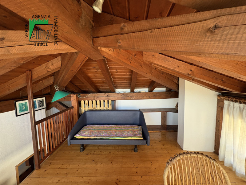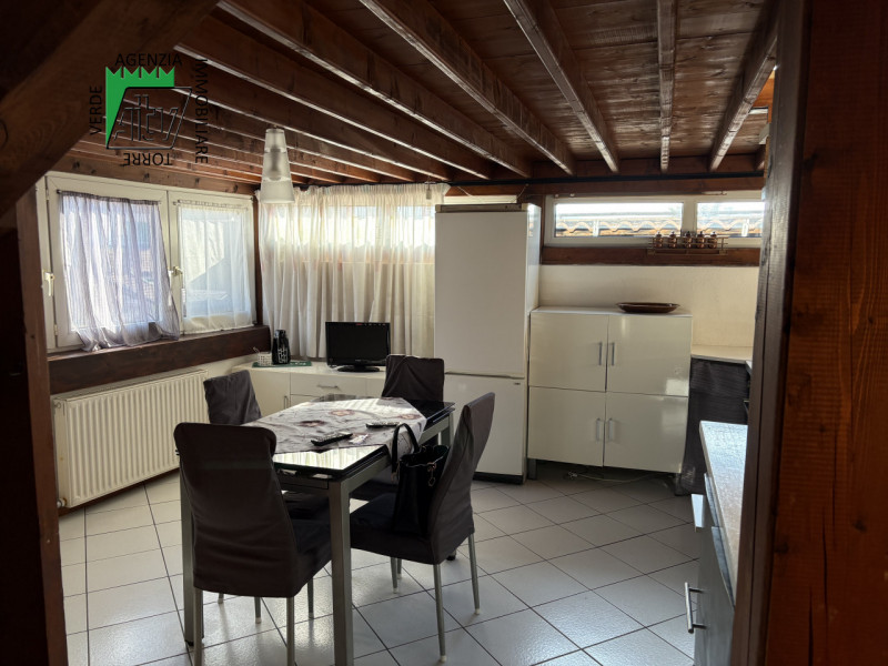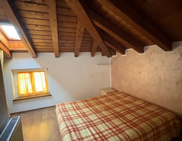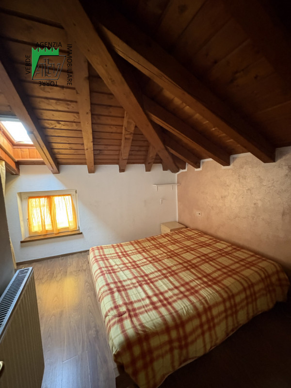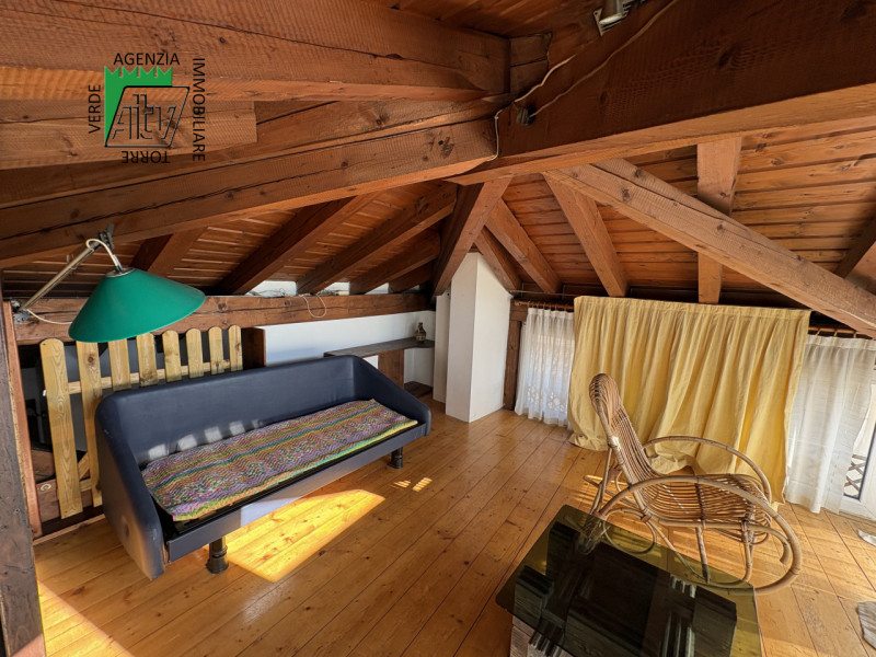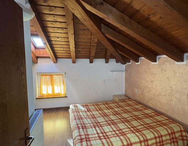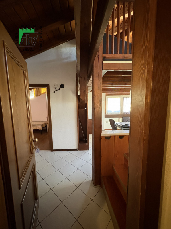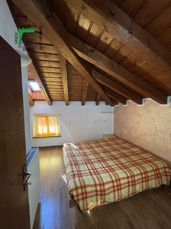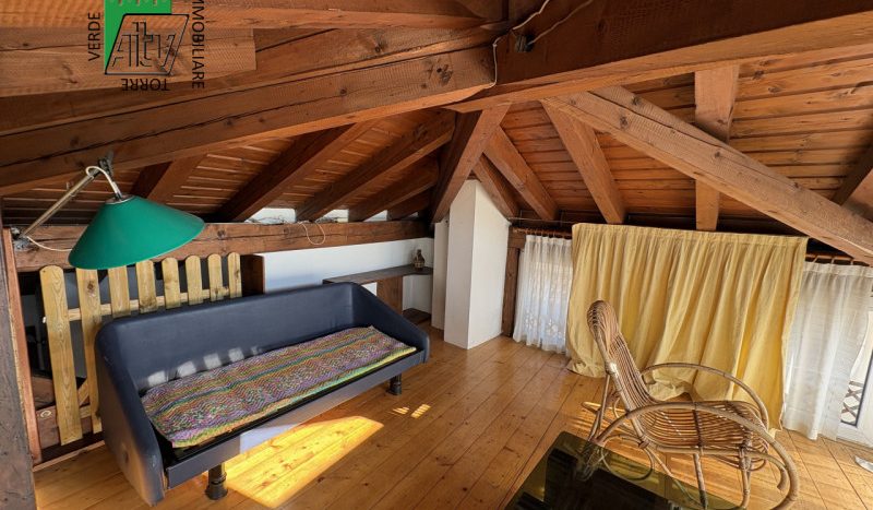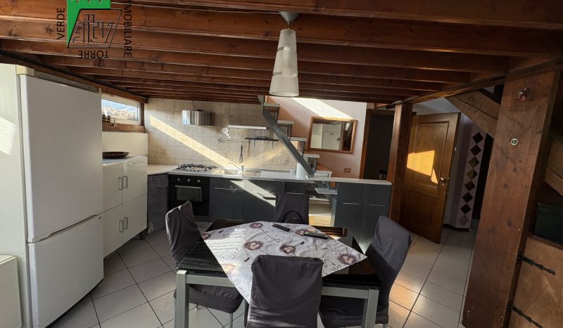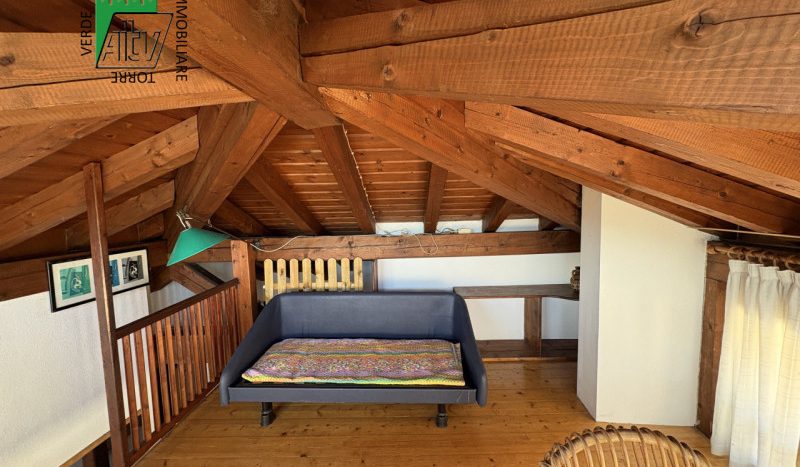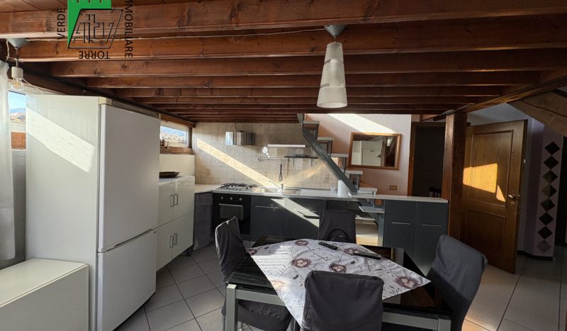 L’appartamento mansardato con travi a vista in legno è composto da: ingresso che conduce a una zona giorno luminosa con angolo cottura, la zona notte è composta da due camere da letto, Il bagno è finestrato, a piano interrato cantina.