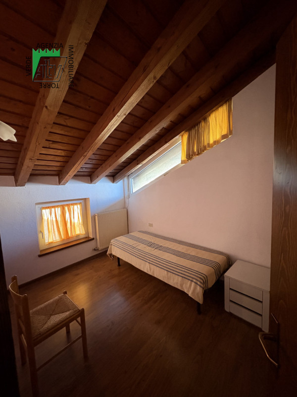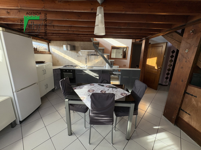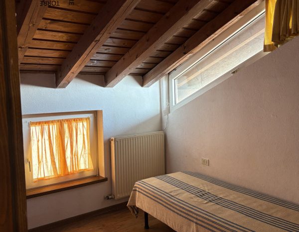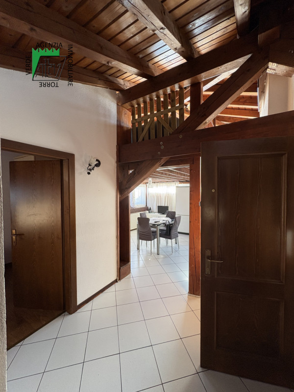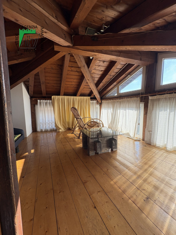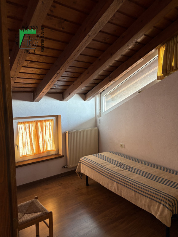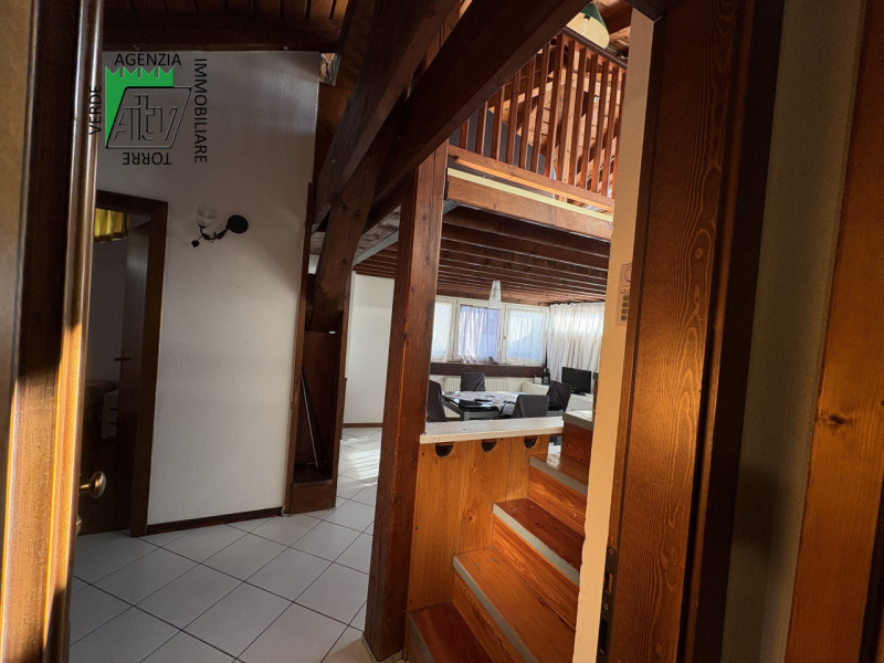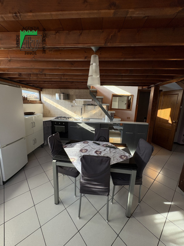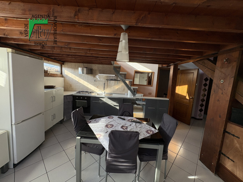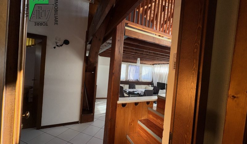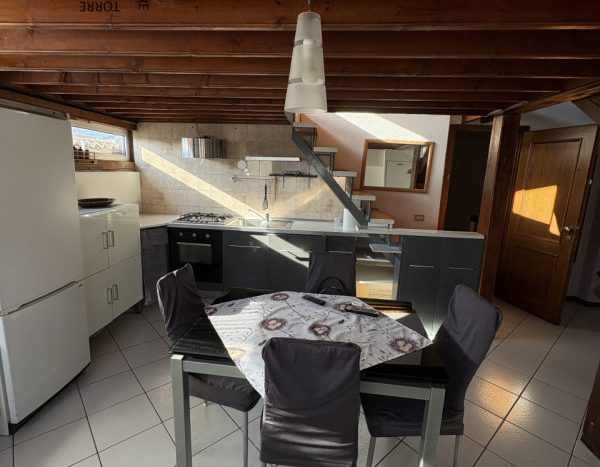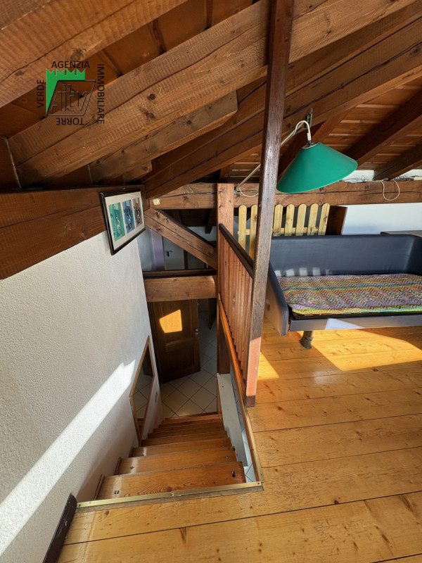 L’appartamento mansardato con travi a vista in legno è composto da: ingresso che conduce a una zona giorno luminosa con angolo cottura, la zona notte è composta da due camere da letto, Il bagno è finestrato, a piano interrato cantina.