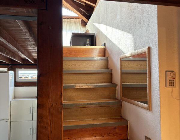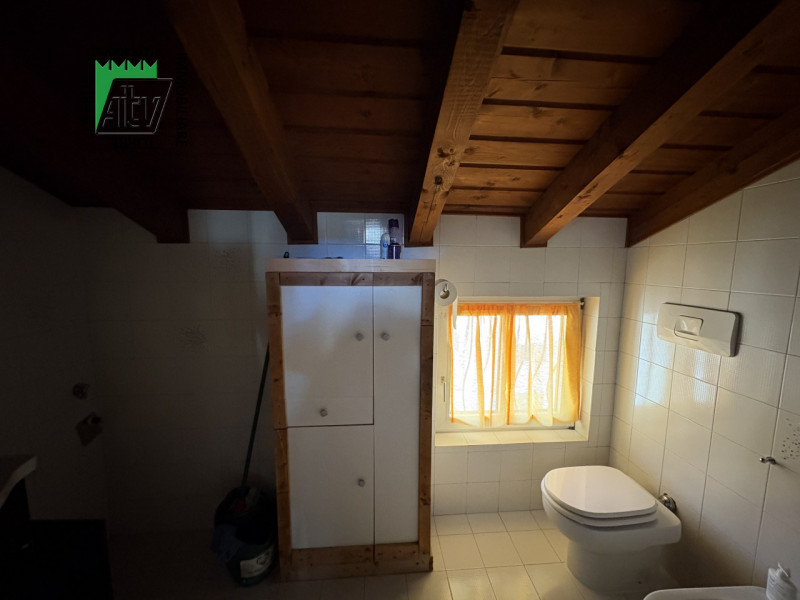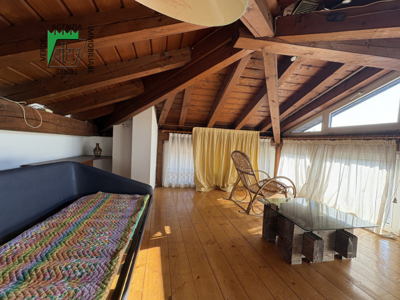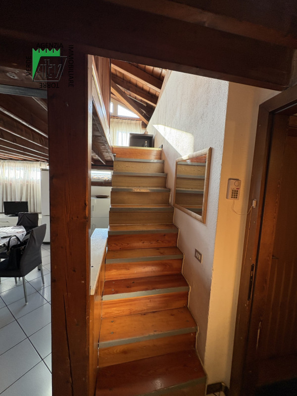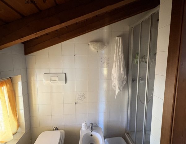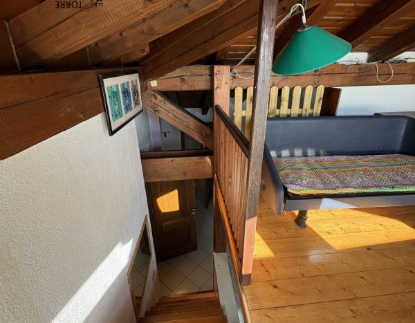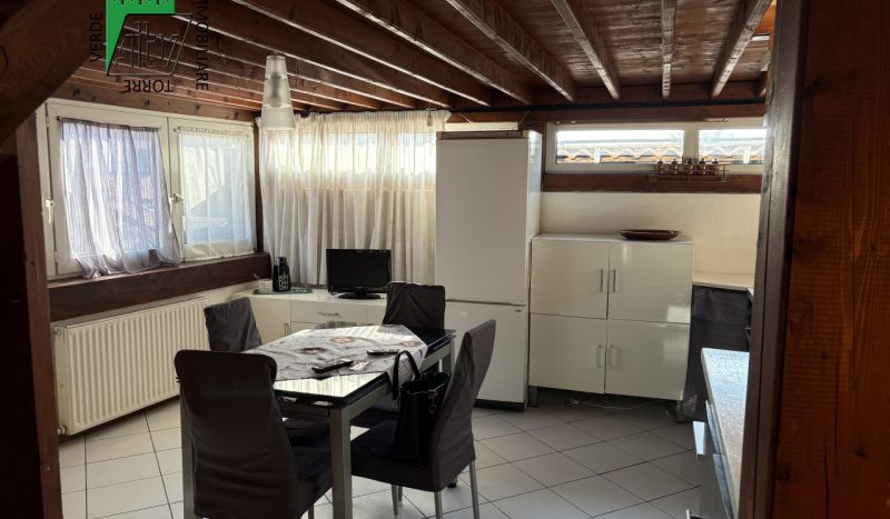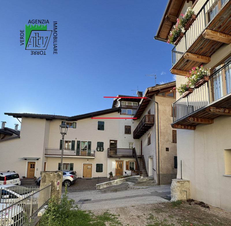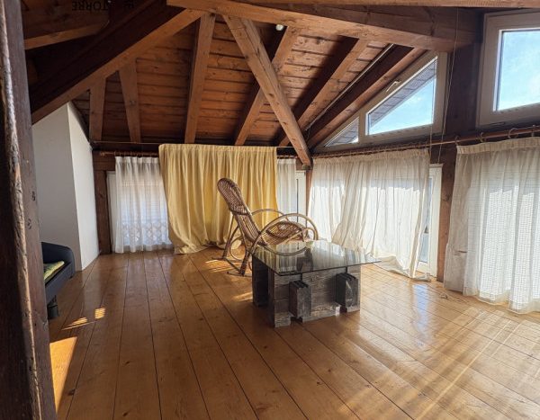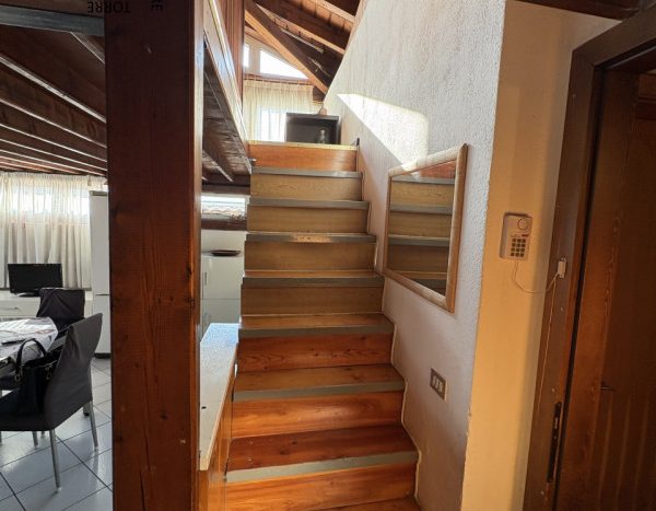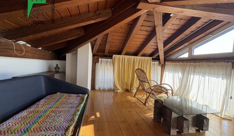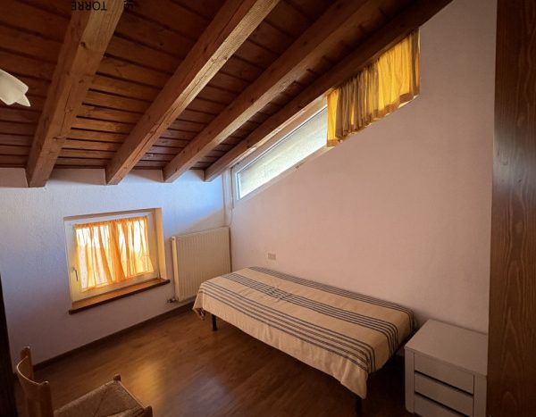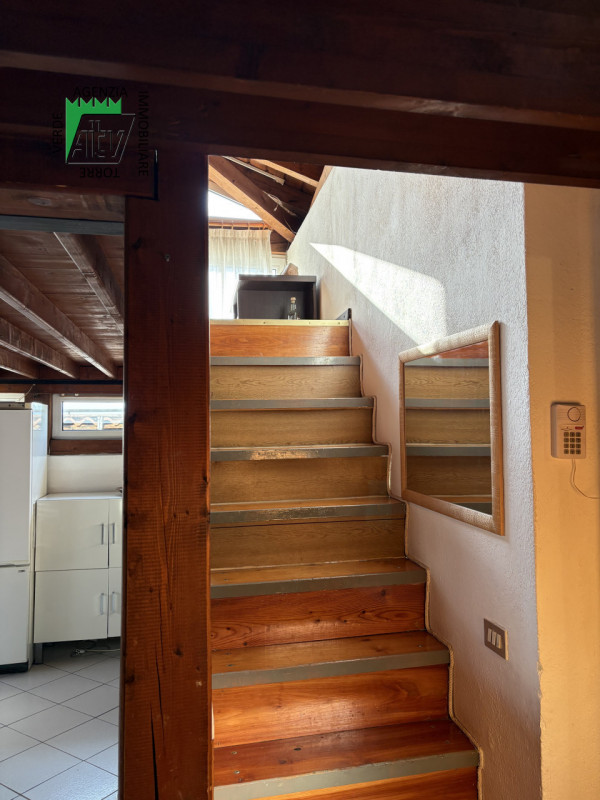 L’appartamento mansardato con travi a vista in legno è composto da: ingresso che conduce a una zona giorno luminosa con angolo cottura, la zona notte è composta da due camere da letto, Il bagno è finestrato, a piano interrato cantina.