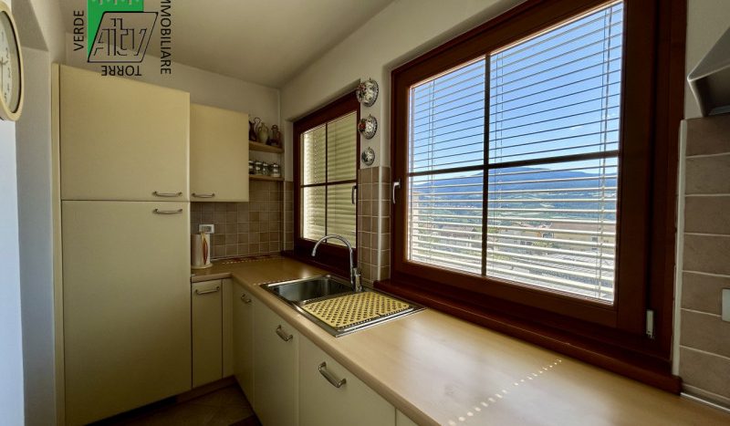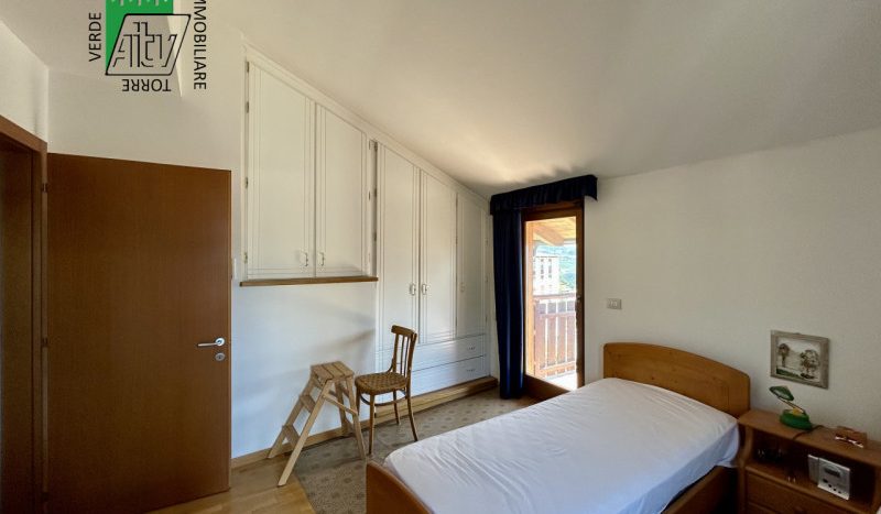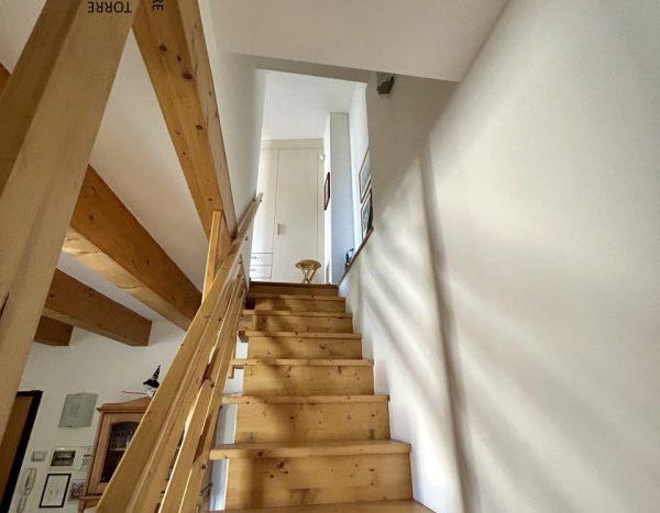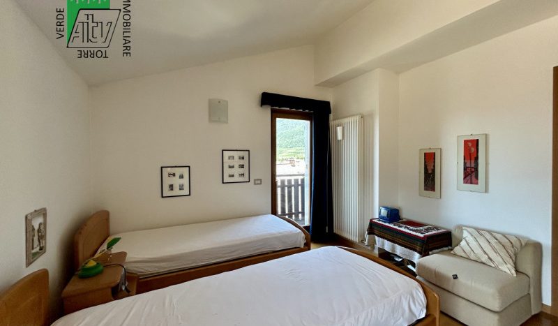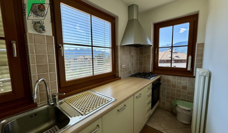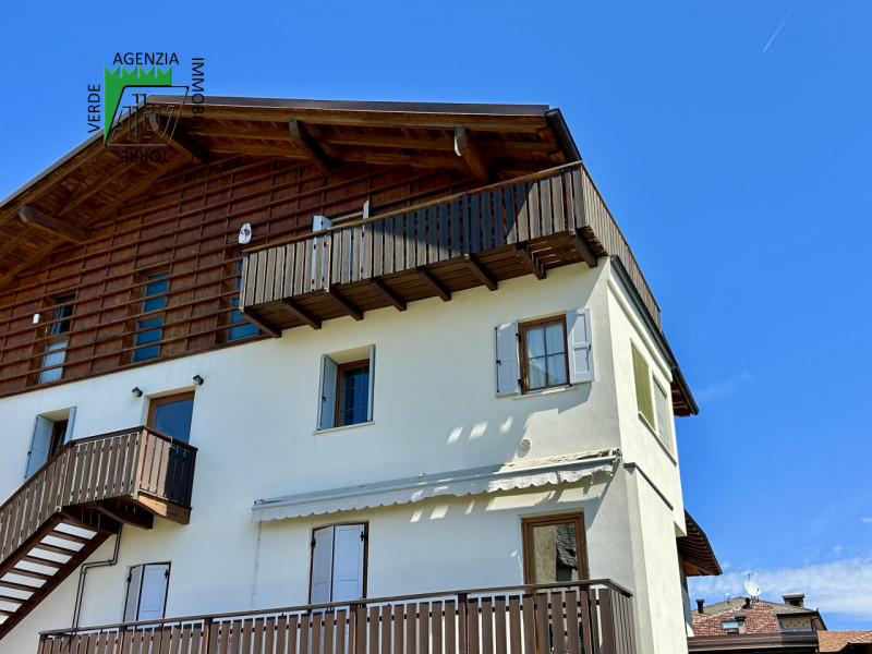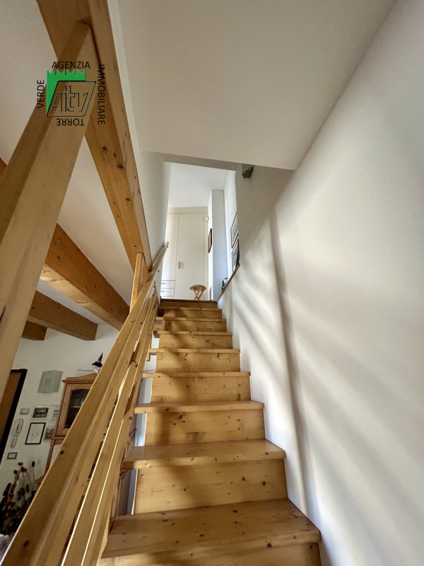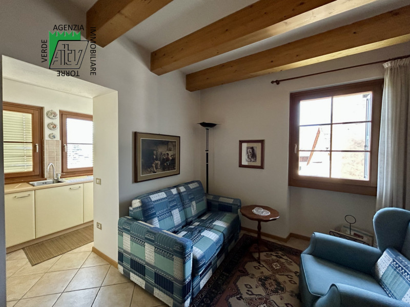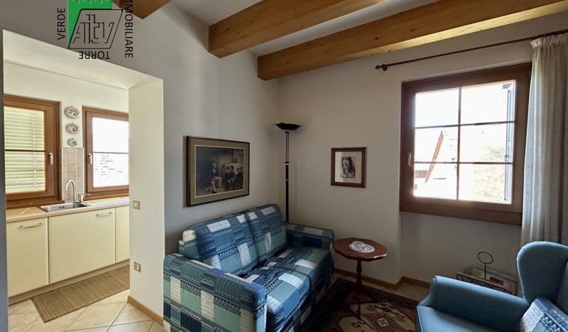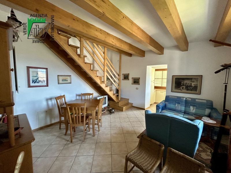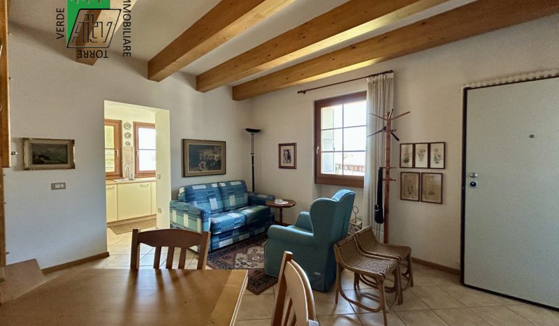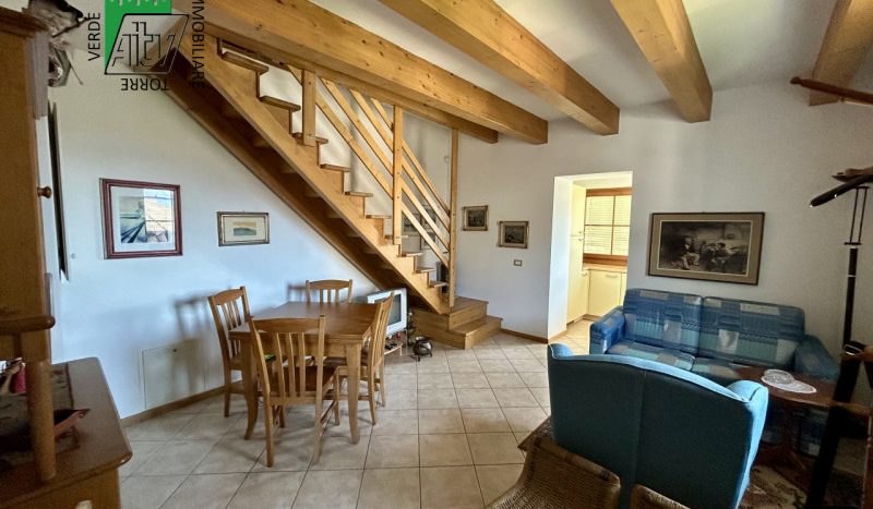 È composto da : soggiorno con cucina; al piano superiore si trova la zona notte con antibagno, bagno finestrato, camera matrimoniale e un ampio balcone esposto a sud-est. È presente inoltre un comodo vano a sottotetto e a piano terra cantina. L’appartamento viene venduto parzialmente arredato. Riscaldamento autonomo.