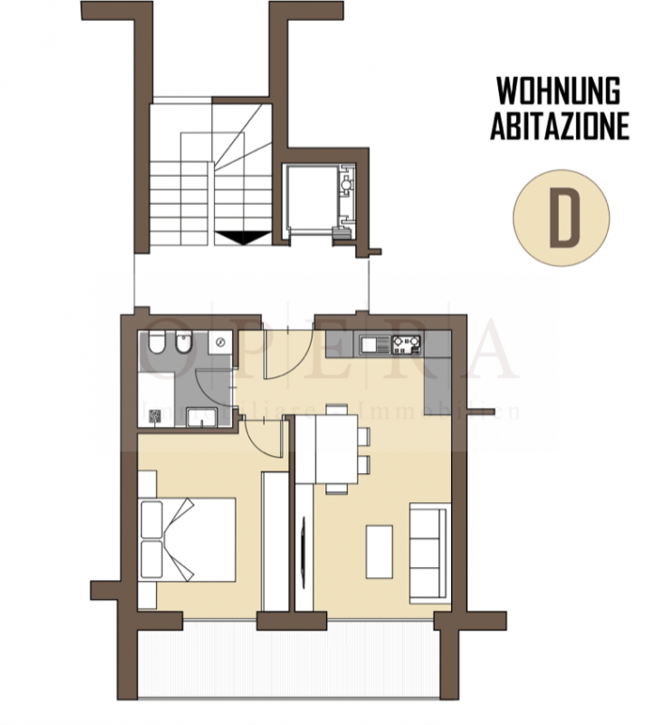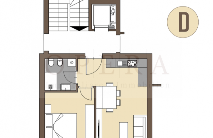 Appartamento D: Proponiamo in vendita bilocale composto da una stanza da letto, soggiorno con cucina, bagno, terrazza e cantina. L’esposizione è Sud.