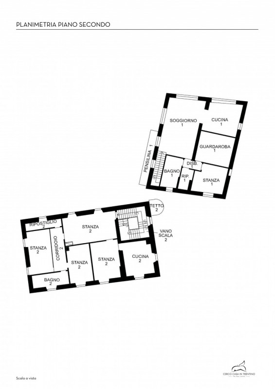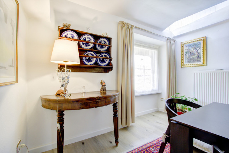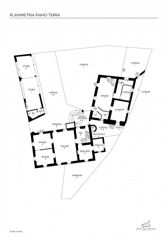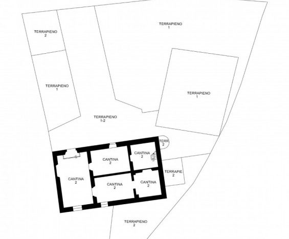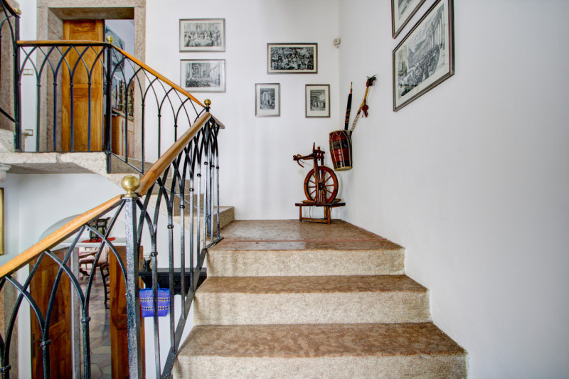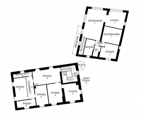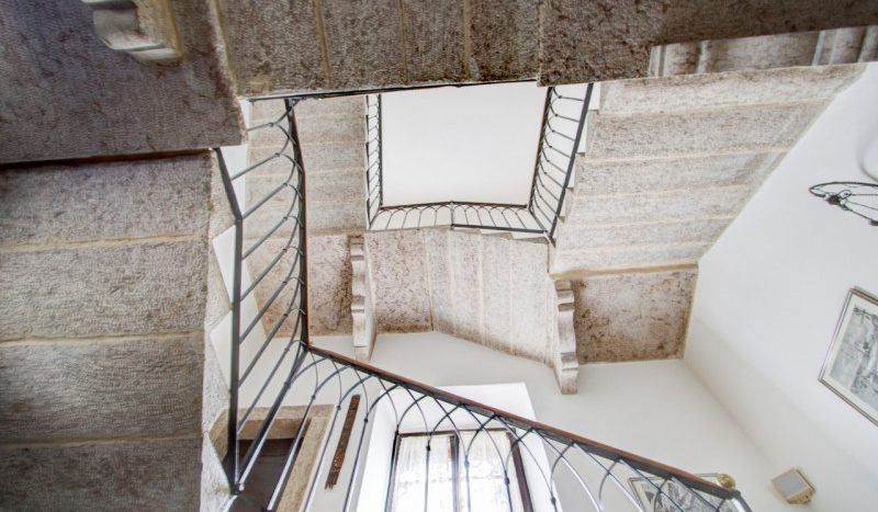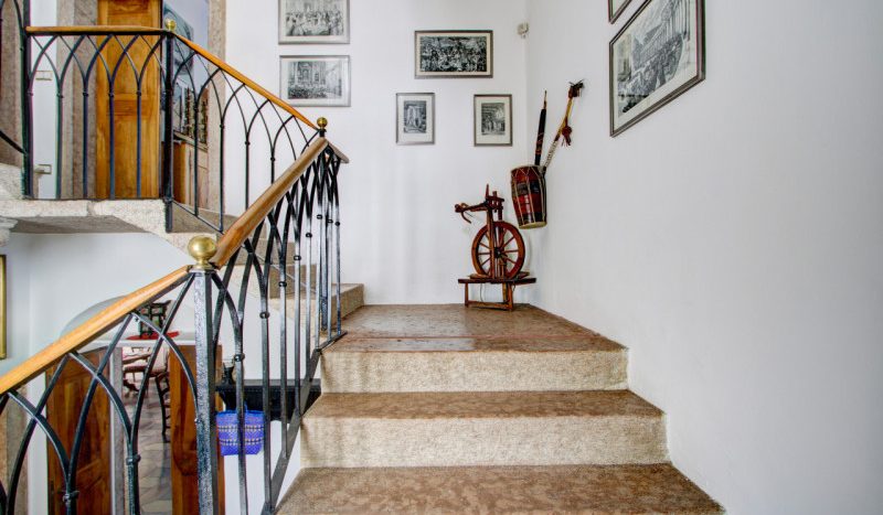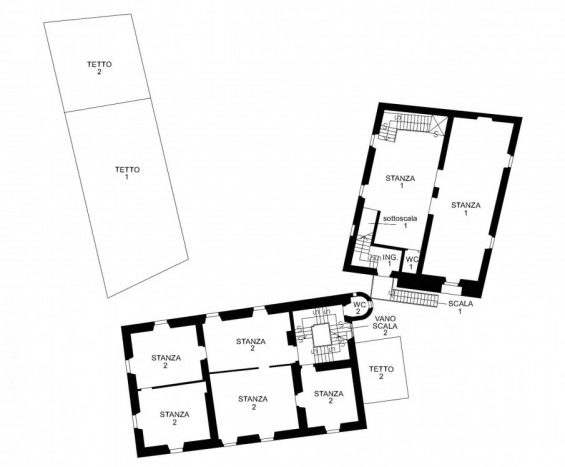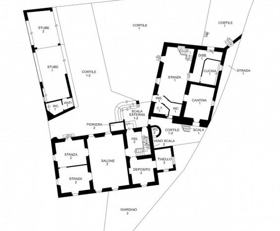 La prima, rivolta a sud, si sviluppa su quattro livelli. Al piano terra si trovano le antiche cantine, ampie e affascinanti, con un pozzo centrale che accoglie i visitatori appena varcata la soglia. Dal cortile, una scala esterna conduce al piano rialzato, dove si apre l’ingresso principale. Qui, una scenografica scala in pietra introduce agli ambienti di rappresentanza: la cucina, che si affaccia direttamente sul giardino privato, un ampio salotto e due camere, oggi utilizzate anch’esse come spazi di accoglienza in stile salotto, come in passato era consuetudine nelle dimore nobiliari. Al primo piano si trovano tre stanze luminose e di generose dimensioni; una di queste è attualmente adibita a disbrigo con funzione di piccolo salotto o studio, offrendo così uno spazio versatile e intimo. Salendo ancora, si accede al piano mansardato, dove trova spazio un appartamento recentemente ristrutturato, intimo e riservato.