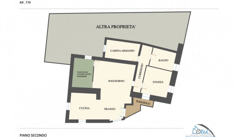 L’accesso principale avviene dal piano terra, tramite un giro scale comune a una sola altra unità immobiliare (attualmente allo stato grezzo).