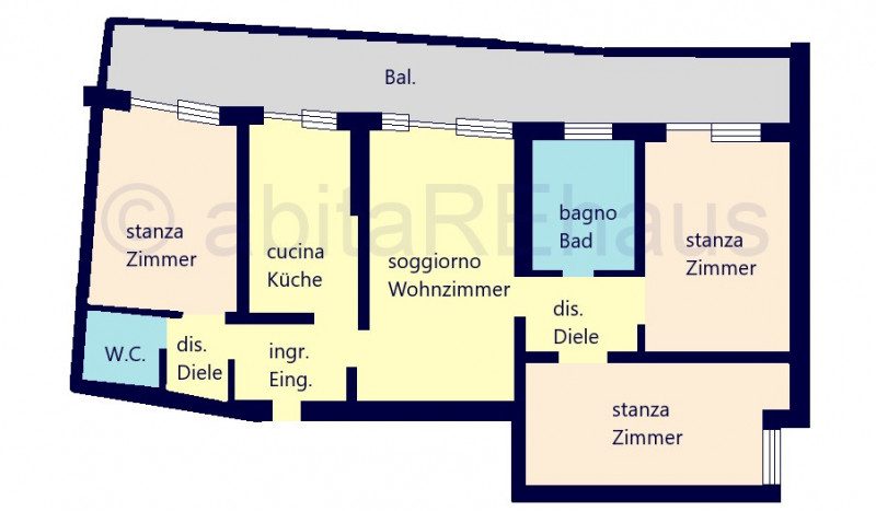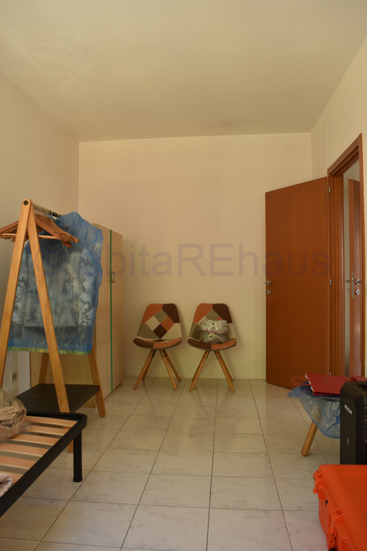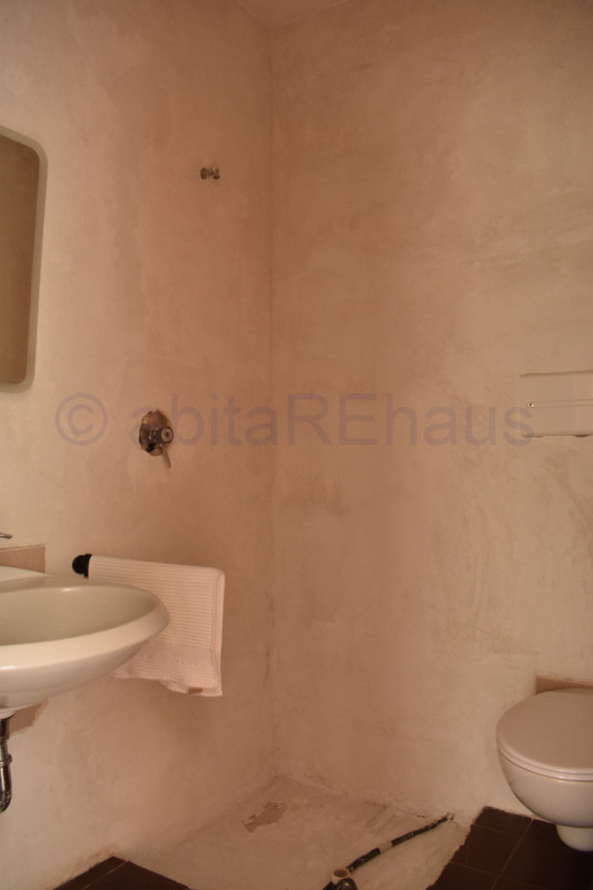 Die Wohnung besteht aus einem großen Eingangsbereich, einem Wohnzimmer, einer separaten Wohnküche und einem großzügigen Balkon entlang der gesamten Westseite. Die drei Schlafzimmer befinden sich auf beiden Seiten der Wohnung: Ein Zimmer verfügt über einen Vorraum mit Dusche/WC auf der Südseite des Hauses. Die beiden anderen Zimmer, ebenfalls geräumig und vielseitig nutzbar, liegen auf der gegenüberliegenden Seite und sind durch einen zweiten Flur vom Wohnbereich getrennt, in dem sich auch das zweite Badezimmer mit Fenster und Badewanne befindet. Die Bäder sowie weitere Details befinden sich im Rohbauzustand – eine begonnene Renovierung wurde nicht fertiggestellt.