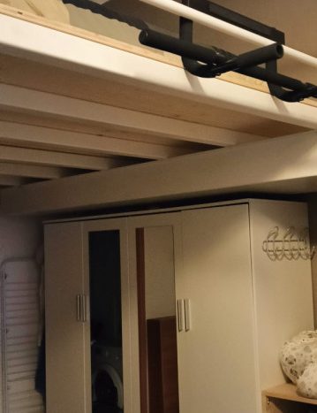 Das Tageslichtbad ist geräumig und mit modernen Sanitäranlagen ausgestattet. Im Schlafzimmer finden wir ein Hochbett, das als erhöhte Doppelzimmer genutzt werden kann, wodurch die darunter liegenden Räume optimal genutzt werden können für großzügige Kleiderschränke und zusätzliche Aufbewahrungsmöbel.