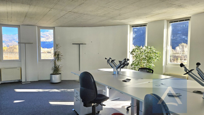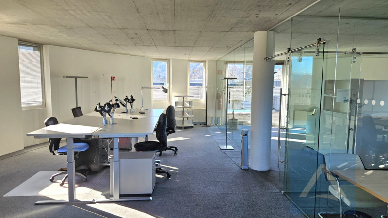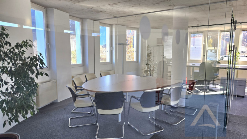 Das Büro bietet vielseitige Räumlichkeiten: einen offenen Bereich, ideal als Arbeitsbereich oder Techniklabor, einen hellen Besprechungs-/Seminarraum mit Glaswänden für Privatsphäre, ohne dabei auf Tageslicht zu verzichten, und einen einladenden Empfangsbereich, perfekt für Kunden und Kollegen. Die Räume sind mit ergonomischen Schreibtischen und bequemen Sitzmöbeln ausgestattet; zahlreiche Fenster bieten einen spektakulären Panoramablick auf die umliegende Bergwelt.