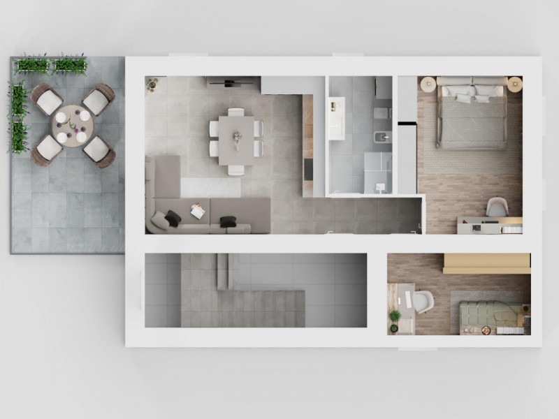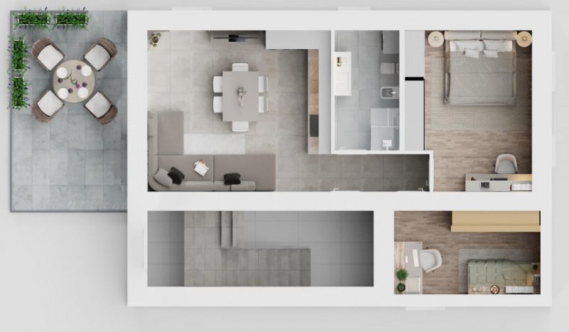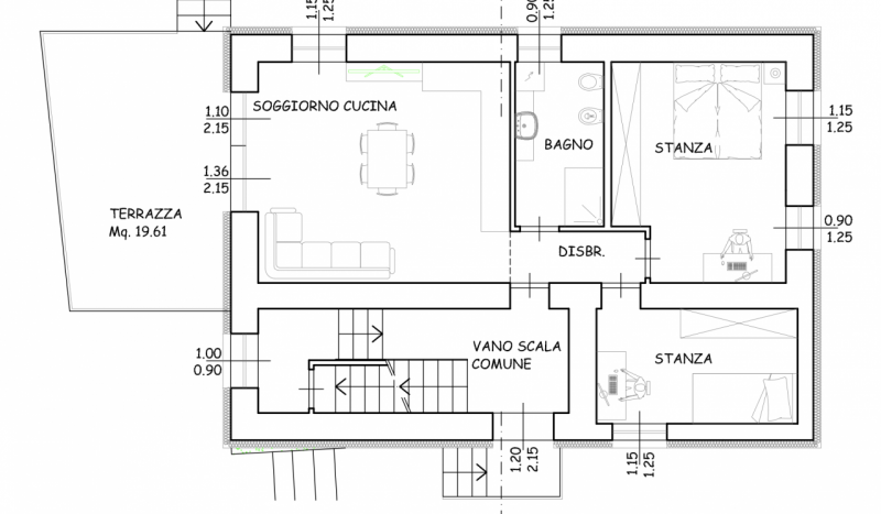 – L’appartamento si compone di ingresso, luminosa zona giorno con accesso al terrazzo esposto a ovest ed al giardino privato di oltre 100 mq, bagno finestrato, disimpegno zona notte, camera matrimoniale e camera singola.