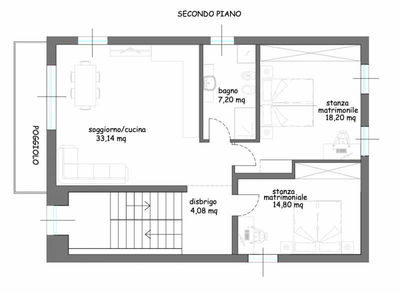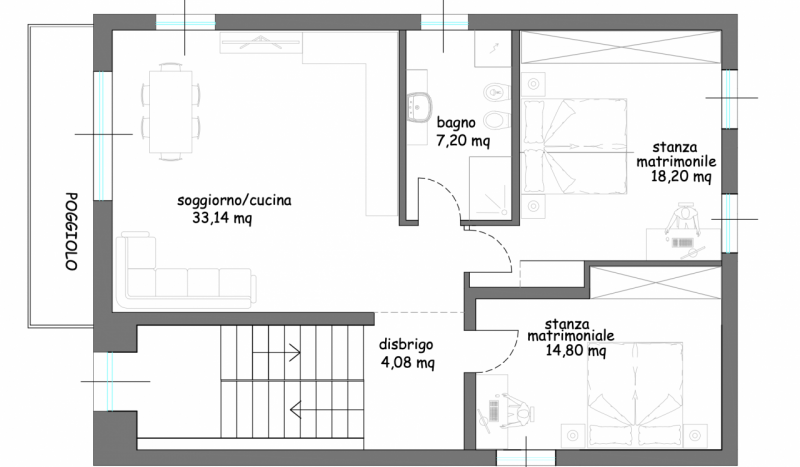 L’appartamento è composto da ingresso indipendente tramite scala privata, ampia e luminosa zona giorno con accesso al balcone esposto a ovest, bagno finestrato con Velux e finestra tradizionale, disimpegno e due camere matrimoniali di 18 mq e 15 mq.