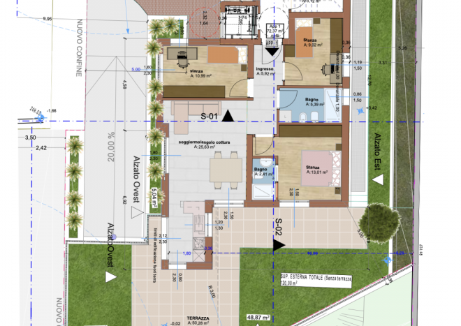 L’appartamento n. 1 qui proposto si trova al piano terra ed è composto da: ingresso, soggiorno con cucina a vista e uscita sull’ampio spazio esterno di oltre 170 m² tra terrazza e giardino, una camera matrimoniale, due camere singole e un bagno finestrato.