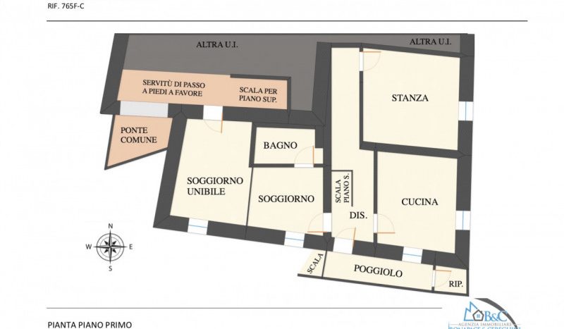 Il primo piano, con ingresso indipendente, si compone di soggiorno (diviso in due stanze ma comodamente collegabile), cucina separata, bagno e una camera matrimoniale.