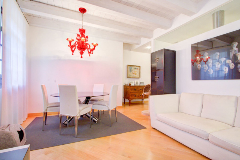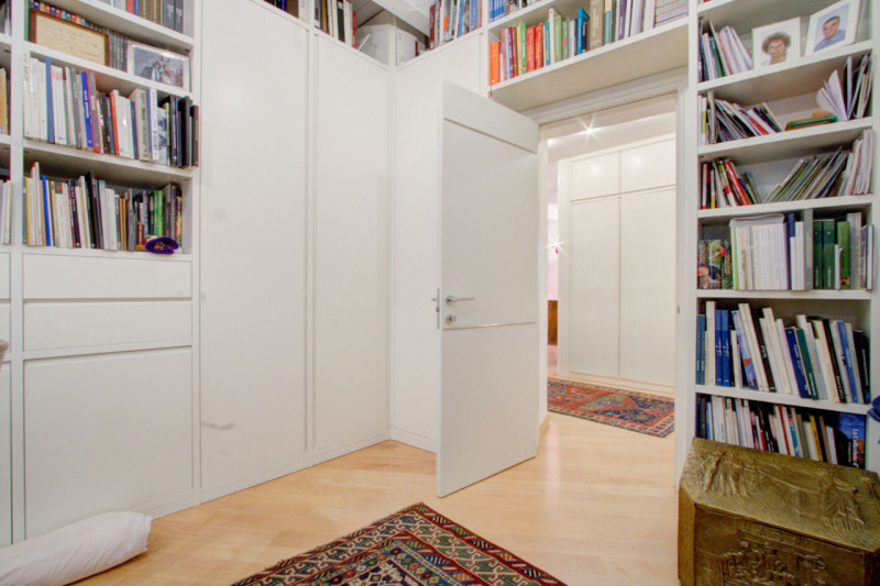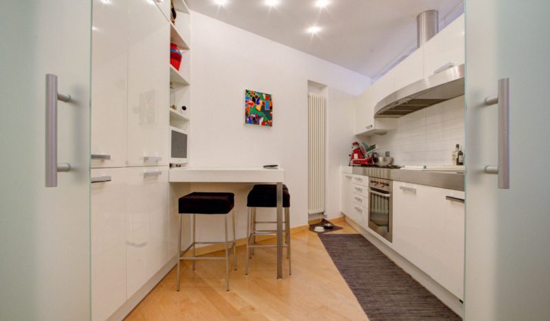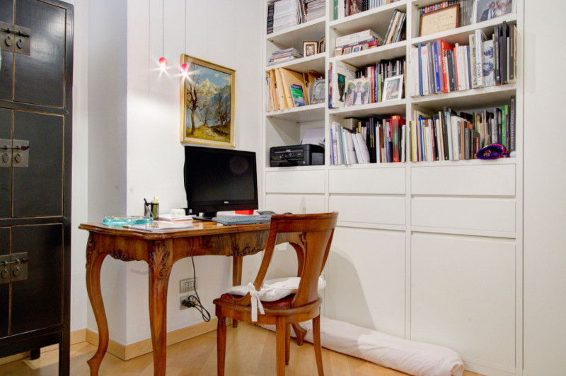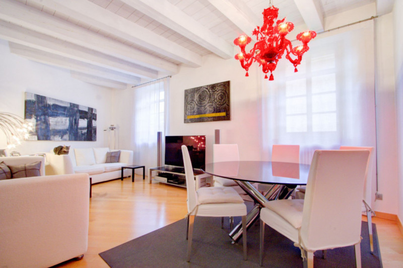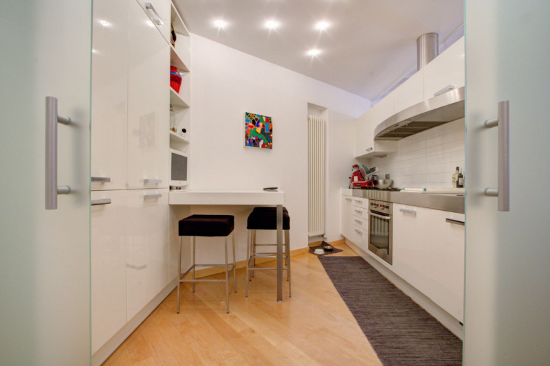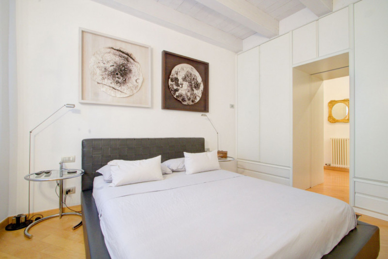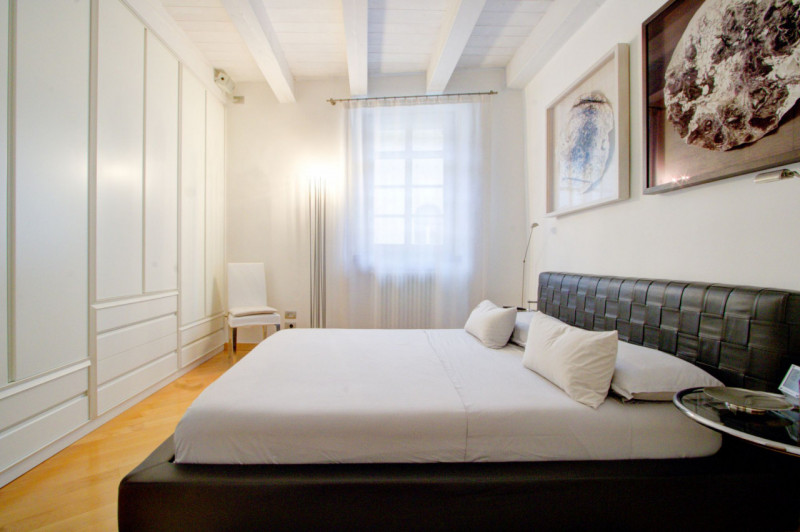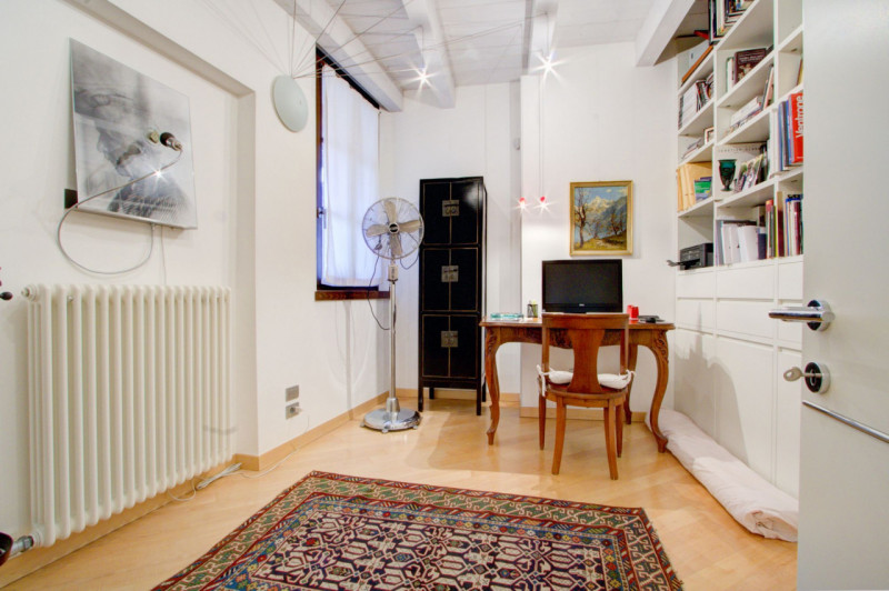 L’appartamento si apre su un ampio corridoio centrale dal quale si diramano gli ambienti della zona notte. La prima stanza, attualmente utilizzata come studio, si affaccia sul balcone, mentre la seconda, affacciata direttamente su Piazza Lodron, è sapientemente nascosta da una raffinata armadiatura su misura in legno laccato, al cui interno si cela una porta scorrevole, creando un effetto scenografico di grande impatto. Proseguendo, si vede una porta in vetro satinato che nasconde la cucina, progettata su misura e dotata di tutti gli elettrodomestici, con una comoda penisola funzionale e dallo stile contemporaneo. Alla sinistra dell’ingresso si trova il bagno, spazioso e ricercato, con doccia rivestita in mosaico di vetro scuro, vasca da bagno e mobile con top in Corian e lavabo integrato. Sul lato opposto, il soggiorno accoglie un’area pranzo con affaccio su Piazza Pasi, garantendo luce naturale e una vista incantevole.
