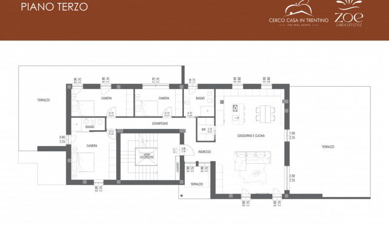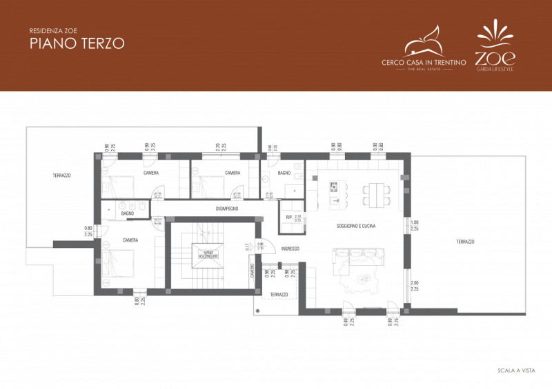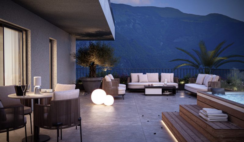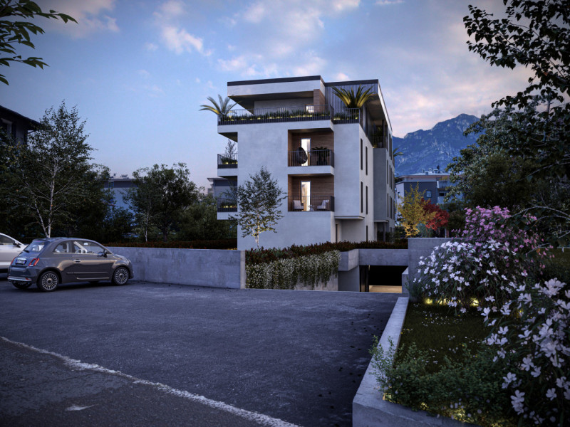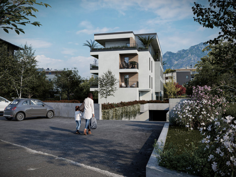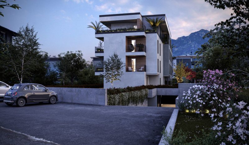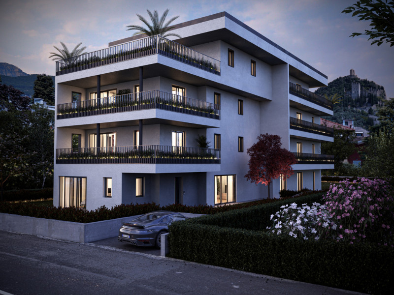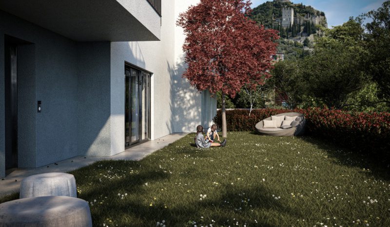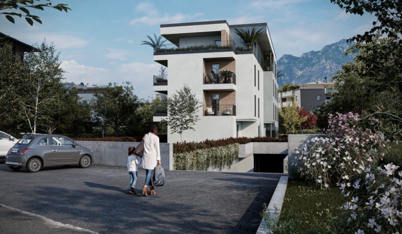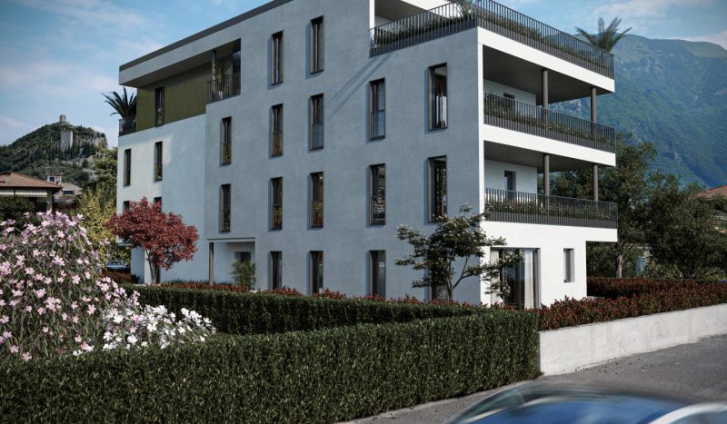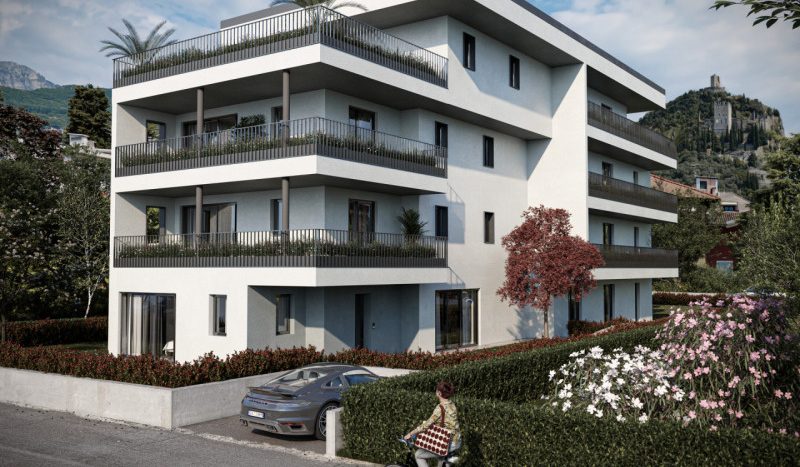 L’edificio, certificato in classe energetica A+, offre appartamenti di pregio con ampie terrazze panoramiche affacciate sul verde circostante e sull’iconico Castello di Arco.