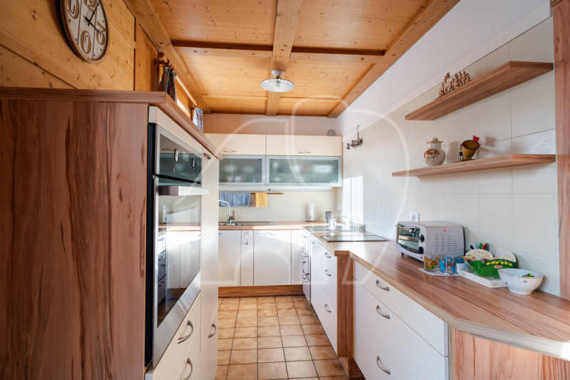 Im Obergeschoss befindet sich eine großzügige Betreiberwohnung mit Kachelofen, drei Schlafzimmern, Wohnzimmer mit Küche, Bad und privater Terrasse. Zusätzlich gibt es ein separates Büro mit eigenem Bad – ideal auch als Personalunterkunft. Eine große Dachbodenfläche bietet weiteres Ausbaupotenzial.