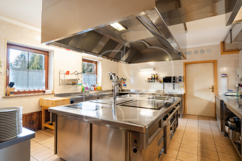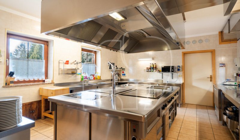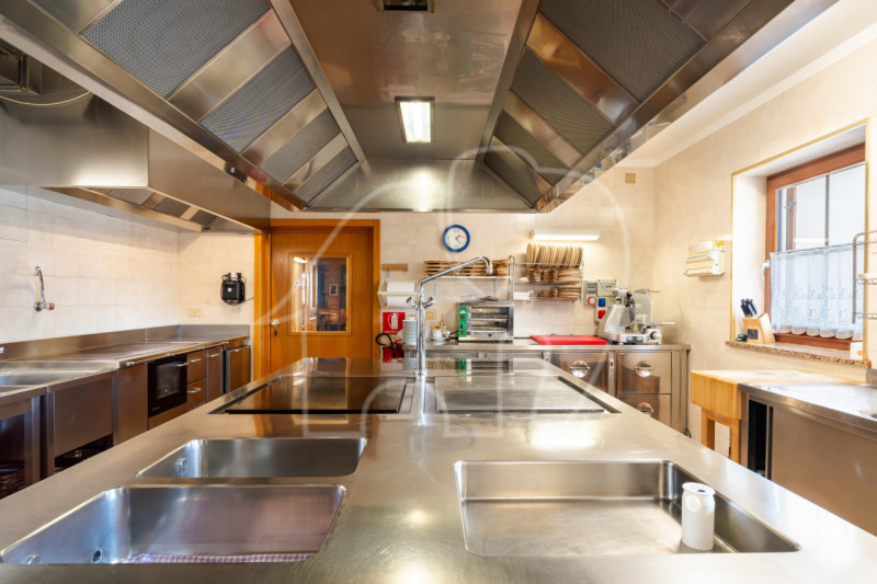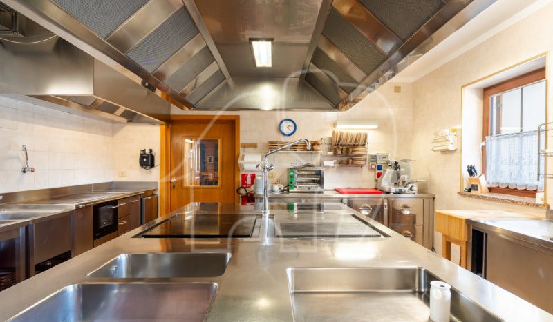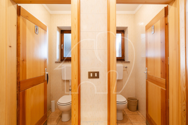 Al primo piano si trova l’appartamento del gestore, una grande unità abitativa con stufa in maiolica, tre camere da letto, soggiorno-cucina, bagno e terrazza privata. A completare il piano, un locale ufficio con bagno indipendente, ideale anche come alloggio per dipendenti.