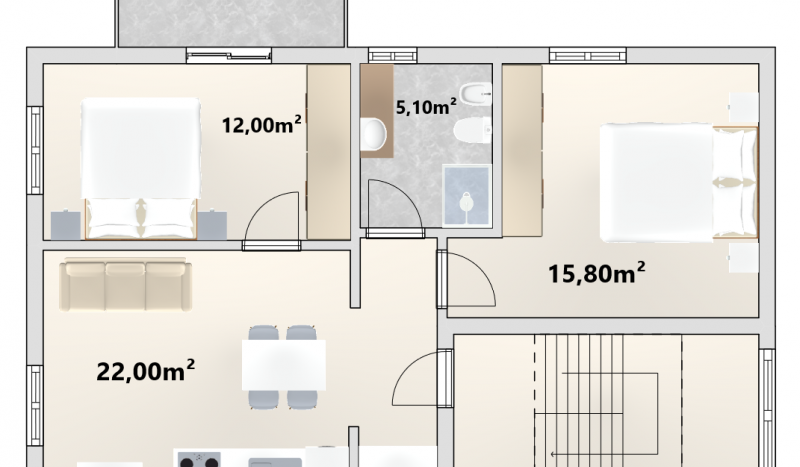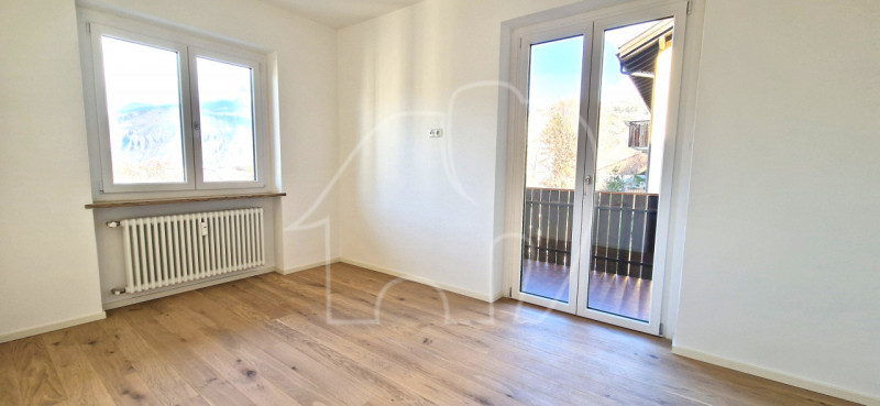 Die Immobilie verfügt über zwei geräumige Schlafzimmer, von denen eines Zugang zu einem eigenen Balkon bietet, ein tagesbelichtetes Badezimmer sowie einen hellen Wohnbereich – von hier und von einem Schlafzimmer aus hat man einen freien und beeindruckenden Blick auf die Berge und die Stadt Bozen.