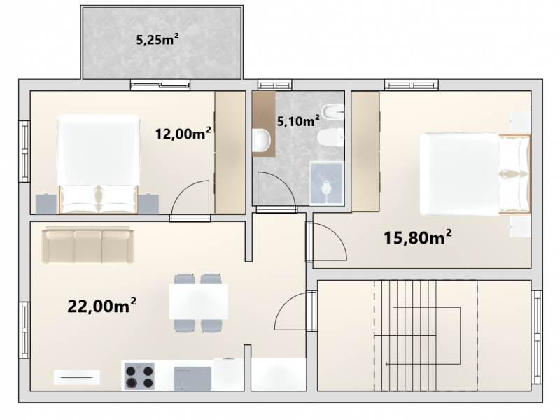 L’immobile dispone di due ampie camere da letto, di cui una con accesso a un balcone privato, un bagno finestrato e un luminoso openspace. Sia dal soggiorno che da una delle camere da letto si gode di una vista libera e suggestiva sulle montagne e sulla città di Bolzano.