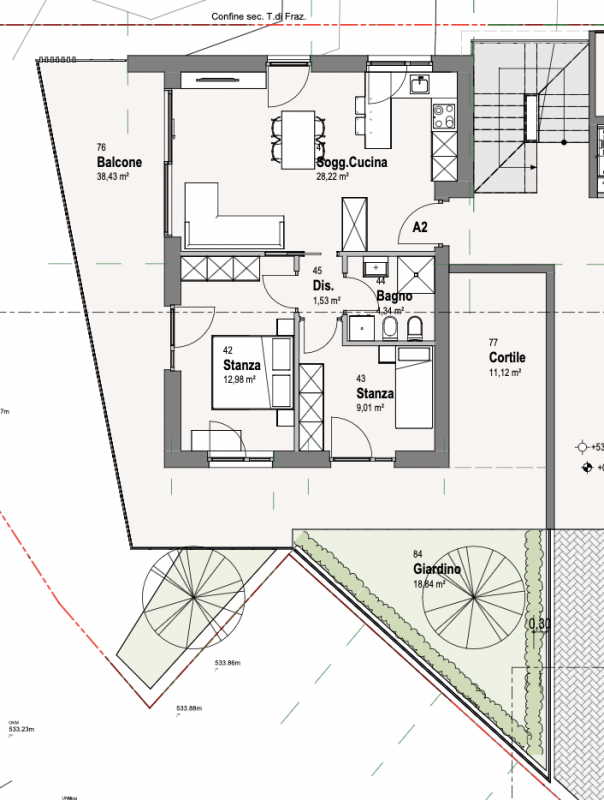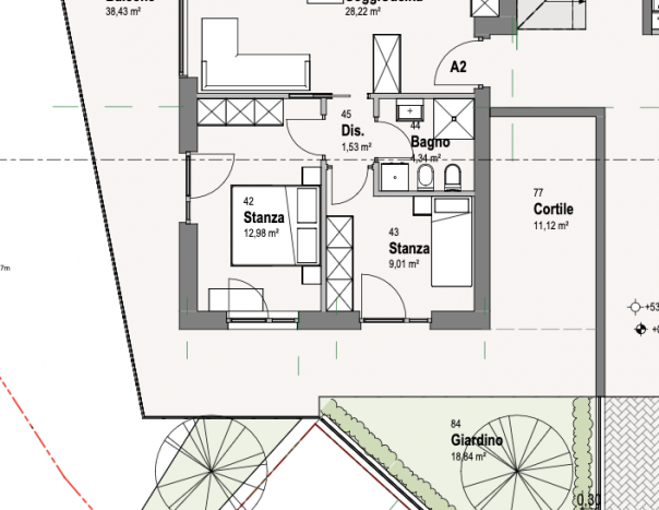 L’appartamento n. 02 è situato al piano terra ed è composto da un soggiorno e una cucina con accesso al balcone che circonda l’abitazione e conduce al cortile, una camera da letto matrimoniale una camera da letto singola con accesso al cortile e al giardino, e un bagno.