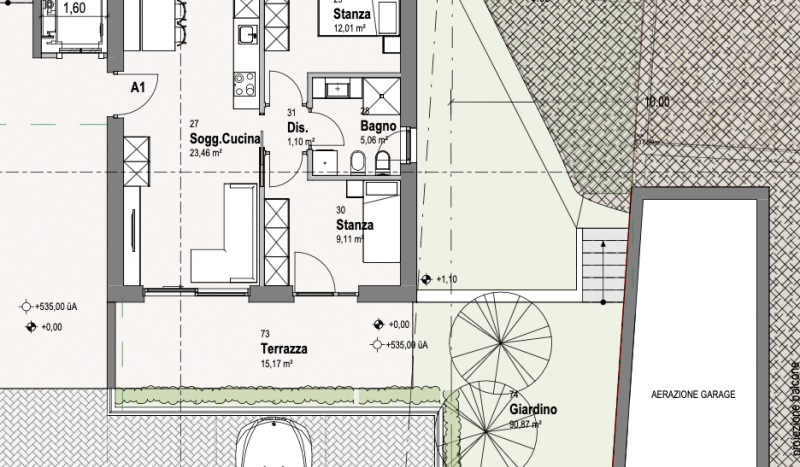 L’appartamento n. 01 è situato al piano terra ed è composto da un soggiorno con accesso al giardino di 90mq e una cucina con accesso al balcone, una stanza da letto matrimoniale, una stanza da letto singola e un bagno.