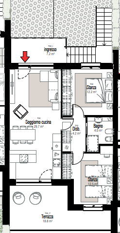 Questo trilocale con terrazza vi offre un ampio spazio abitativo con accesso diretto alla vostra terrazza, ideale per trascorrere ore di relax all’aperto.