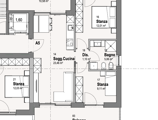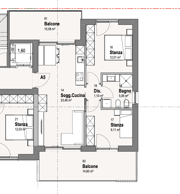 L’appartamento n. 05 è situato al secondo piano ed è composto da un soggiorno e una cucina con accesso al primo balcone una camera da letto singolo anch’essa con accesso al secondo balcone, una camera da letto matrimoniale e un bagno.