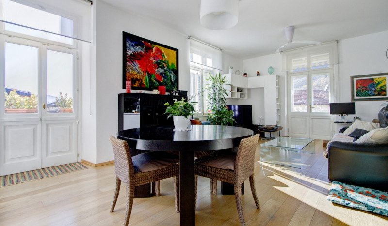 La zona living, concepita in stile open space, è accessibile da due ingressi ed è composta da una cucina con grande isola centrale, dotata di accesso al primo balcone esposto a sud, e da un luminoso salotto con uscita sul secondo balcone esposto a ovest. Grazie alla doppia esposizione, questo spazio risulta particolarmente arioso e luminoso; il pavimento in legno chiaro ne valorizza ulteriormente ampiezza e raffinatezza. Adiacente alla cucina è presente anche un comodo ripostiglio. Proseguendo verso la zona notte, troviamo due camere da letto: una padronale con bagno finestrato privato, una seconda stanza singola ed un ampio bagno, anch’esso finestrato. L’appartamento è completo di riscaldamento a pavimento, ascensore e un grande garage singolo.