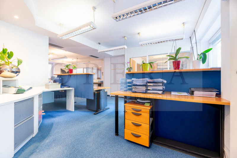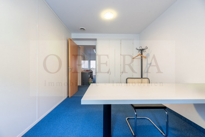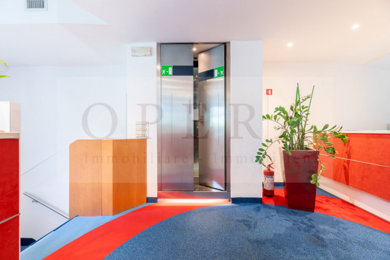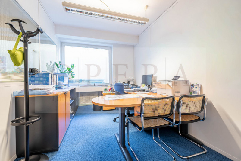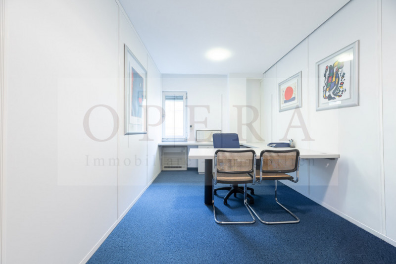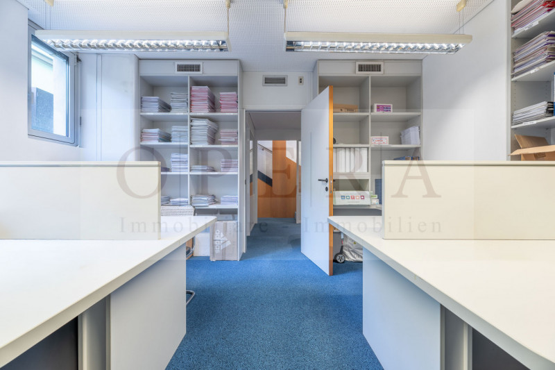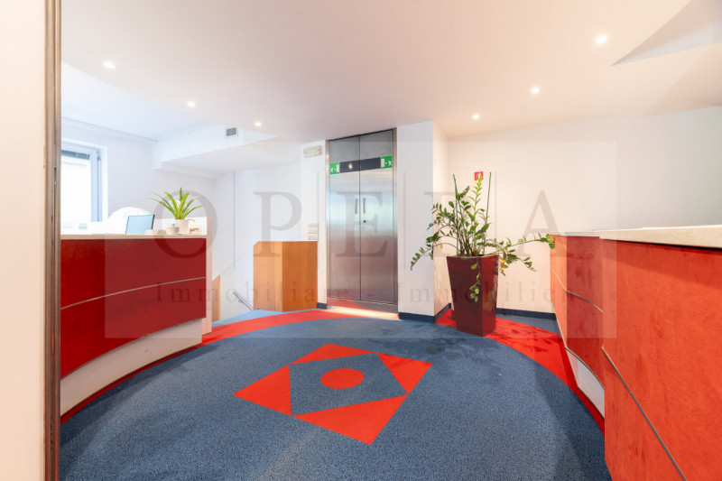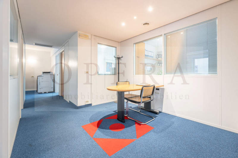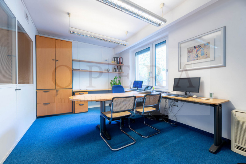 Il piano rialzato ospita sette uffici, facilmente adattabili a diverse esigenze lavorative, come studi professionali, sale riunioni o ambienti open space.