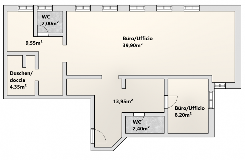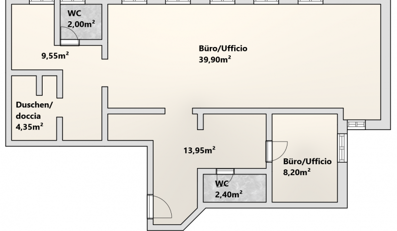 Grazie alle numerose finestre, i locali sono inondati di luce e creano una piacevole atmosfera di lavoro. Sono inoltre disponibili due bagni. È presente anche un locale doccia, dotato di 2 docce.