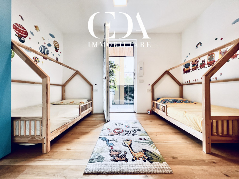 La zona notte, sapientemente distribuita, comprende tre camere da letto: una matrimoniale, una doppia con terrazzo privato e una singola con ulteriore terrazzo, oltre a due bagni finestrati con doccia, realizzati con materiali e dettagli di pregio.