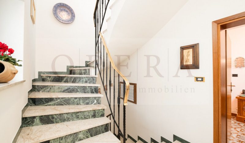 Composizione: al piano terra: Hobby room, palestra, ripostigli, taverna, giardino con vista panoramica; questo spazio potrebbe essere trasformato in un appartamento indipendente. Al piano primo: Soggiorno, cucina, due stanze, doppi servizi, balcone con vista incantevole; al piano secondo: soggiorno, cucina, due camere da letto ed un bagno, due balconi. Al piano interrato: garage per 5 autovetture, cantine e locali hobby.