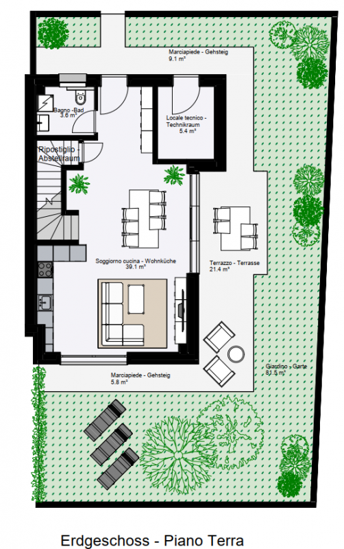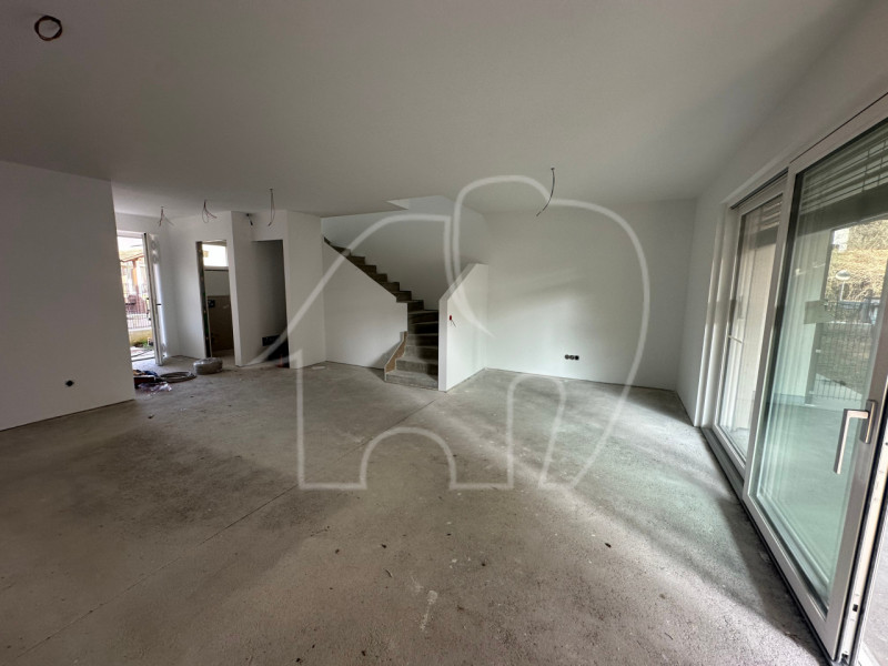 Das Erdgeschoss überzeugt mit einem großzügigen, lichtdurchfluteten Wohnbereich samt offener Küche, einem praktischen Abstellraum, einem Gäste-WC und Zugang zum eigenen Garten – ideal für entspannte Stunden im Freien.