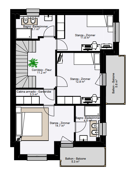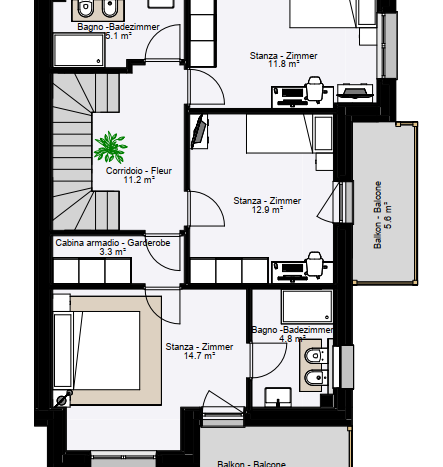 Al piano superiore si trovano tre camere da letto ben distribuite, due bagni moderni, un balcone e un disimpegno centrale. La camera matrimoniale offre un comfort esclusivo con bagno privato e cabina armadio.