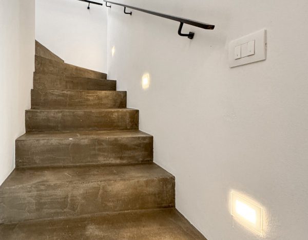 Al primo piano si accede all’appartamento principale composto da ingresso, un guardaroba, un ampio soggiorno e cucina con accesso diretto alla terrazza esposta a ovest, una camera singola, una lavanderia e un bagno finestrato con doccia.