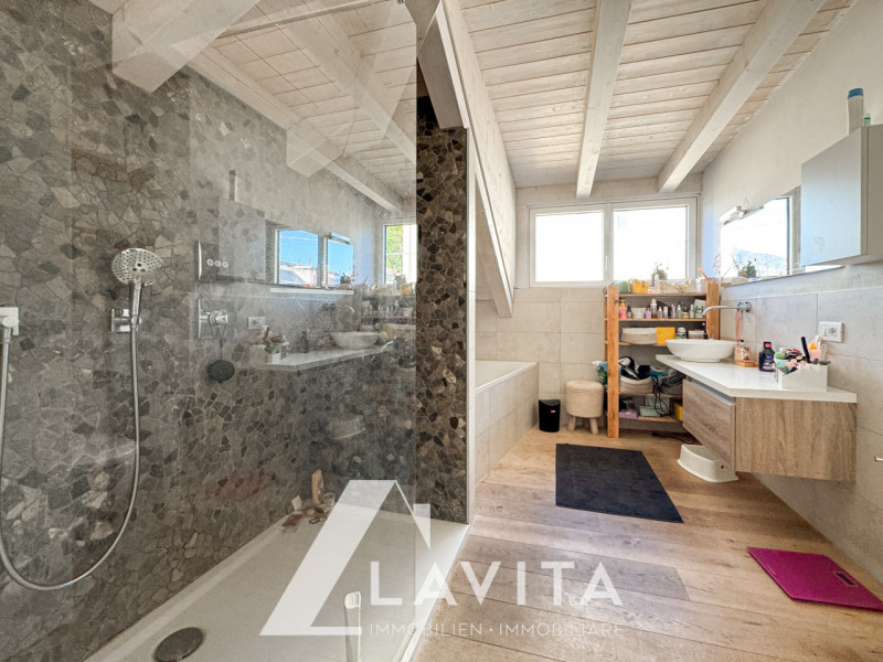 Durch eine interne Treppe gelangt man in den zweiten Stock, das über ein Doppelschlafzimmer mit begehbarem Kleiderschrank und einem Tageslichtbad mit Badewanne und Dusche verfügt. Außerdem gibt es ein weiteres Doppelzimmer mit begehbarem Kleiderschrank und Bad mit Badewanne, ein zusätzliches Einzelzimmer sowie ein weiteres Bad mit Fenster und Dusche.