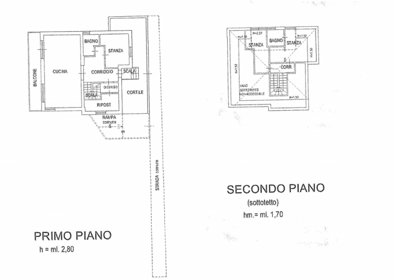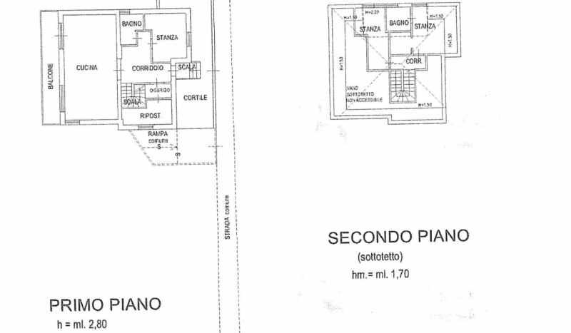 L’immobile si sviluppa su tre livelli. Al piano terra si accede a un primo appartamento bilocale, composto da cucina e soggiorno, una camera matrimoniale, un bagno finestrato con vasca e doccia, e un ripostiglio.