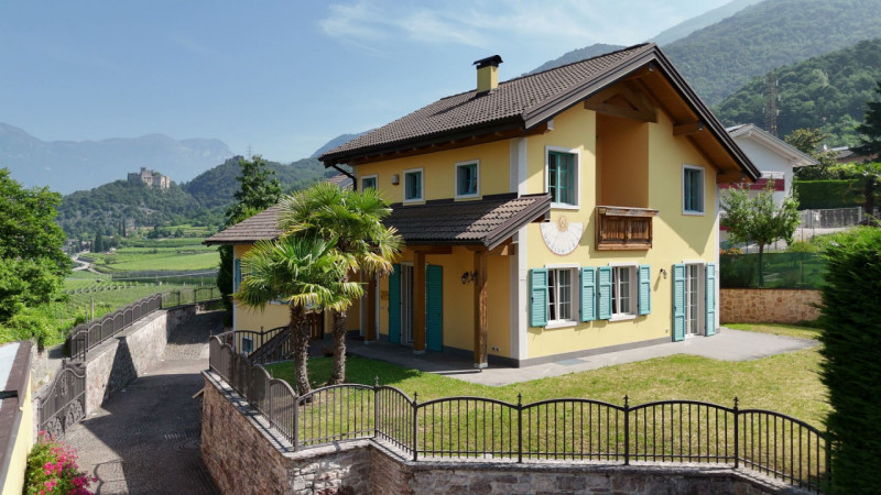 Al piano terra, l’abitazione si apre su un ampia zona living con tavolo da pranzo e accesso diretto al giardino, ideale per vivere in continuità con l’esterno. La cucina, separata, è funzionale e ben distribuita. Completano il piano una stanza attualmente adibita a ufficio, una camera da letto e due bagni. All’interno del giardino della villa, trova spazio una splendida zona barbecue coperta, realizzata in muratura e rifinita con elementi in ferro battuto decorativo. Il tetto a falda in tegole offre riparo dal sole e dalla pioggia, rendendo questo angolo perfetto per grigliate in ogni stagione. La struttura è dotata di un ampio piano di lavoro, lavandino in pietra e barbecue integrato, il tutto incorniciato da una siepe alta e rigogliosa che garantisce privacy e tranquillità. Una vera oasi di convivialità, ideale per trascorrere momenti all’aria aperta con famiglia e amici. Il primo piano accoglie una zona living secondaria con travi a vista da cui si intravede un soppalco. Sullo stesso piano troviamo una camera da letto matrimoniale, una camera mansardata, un bagno e una loggia coperta con affaccio sul paesaggio circostante. Attraverso una scala interna si accede al soppalco, oggi adibito a studio, con affaccio sulla zona giorno e suggestiva vista sulle montagne. Salendo le scale in legno si arriva nel piccolo soppalco ricavato per creare un ulteriore zona relax o ufficio con vista sul castello. Il piano seminterrato ospita un garage doppio molto ampio, cantina, locale lavanderia e una spaziosa zona multiuso predisposta per stube, palestra o sala hobby, completamente personalizzabile secondo le esigenze dell’acquirente.