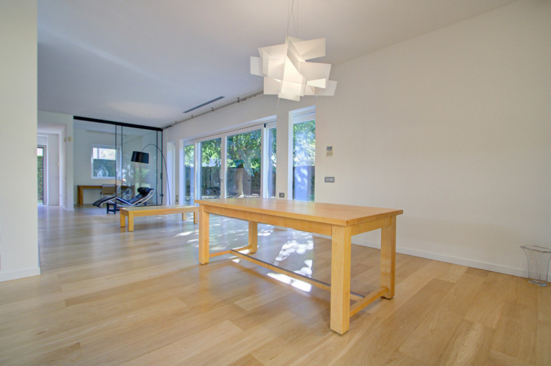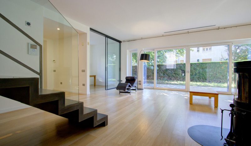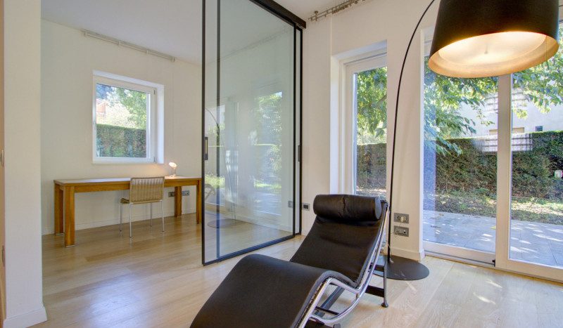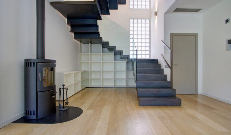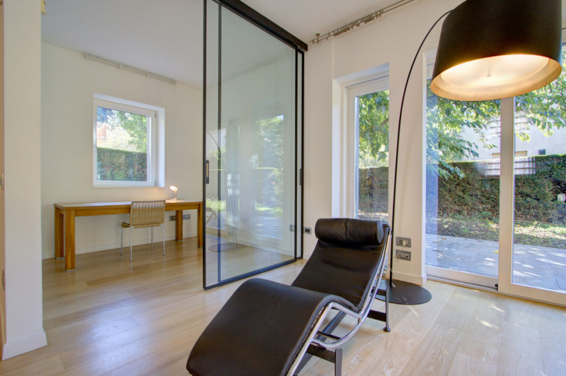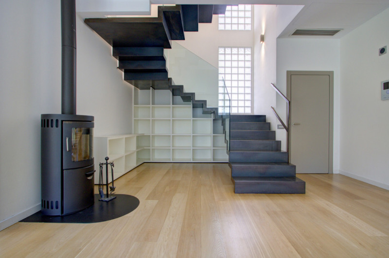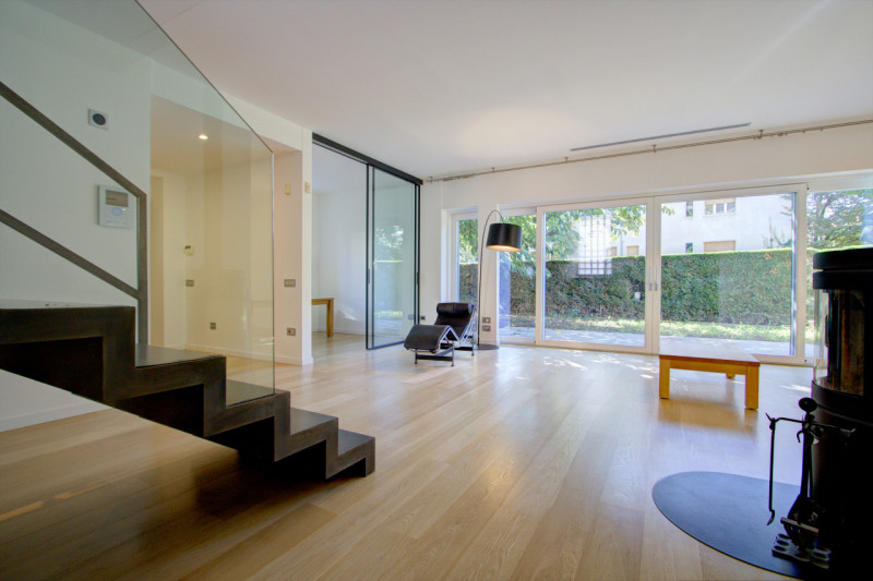 L’abitazione si sviluppa su due livelli e si distingue per la qualità degli spazi e la luminosità degli ambienti. Al piano terra si trova un’ampia zona living composta da una cucina abitabile arredata, un soggiorno di generose dimensioni con grandi aperture vetrate che affacciano sul giardino, garantendo un’eccezionale luce naturale. Un piccolo studio, separato da una porta in vetro, offre uno spazio riservato e funzionale. Completano il piano un bagno di servizio e un ripostiglio già predisposto per l’installazione di un ascensore, con vano corrispondente anche al piano superiore. Elemento di forte carattere della zona giorno è la scala in ferro nero, visibile già dall’ingresso, sotto la quale è stata realizzata una libreria su misura. A completare l’atmosfera accogliente, una stufa posizionata strategicamente al centro dell’ambiente per riscaldare in modo omogeneo la casa.