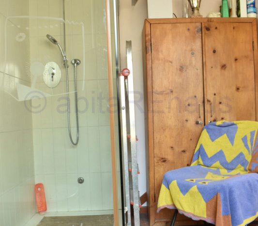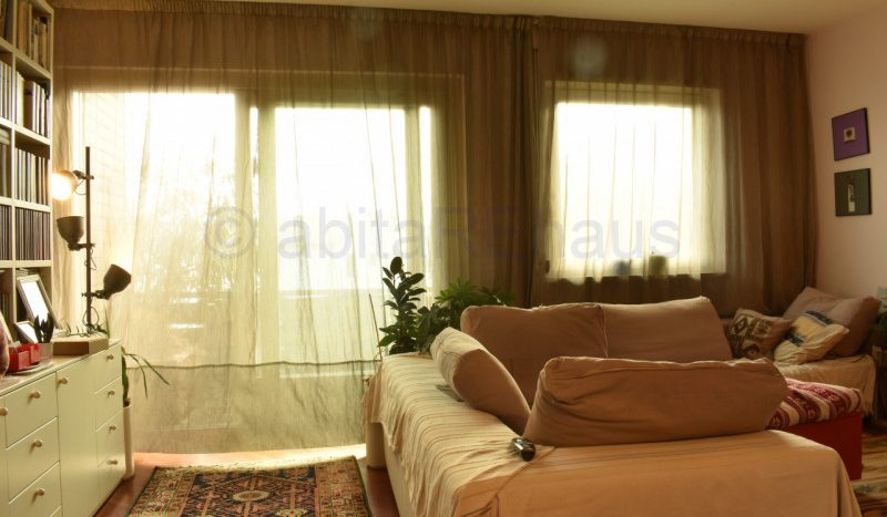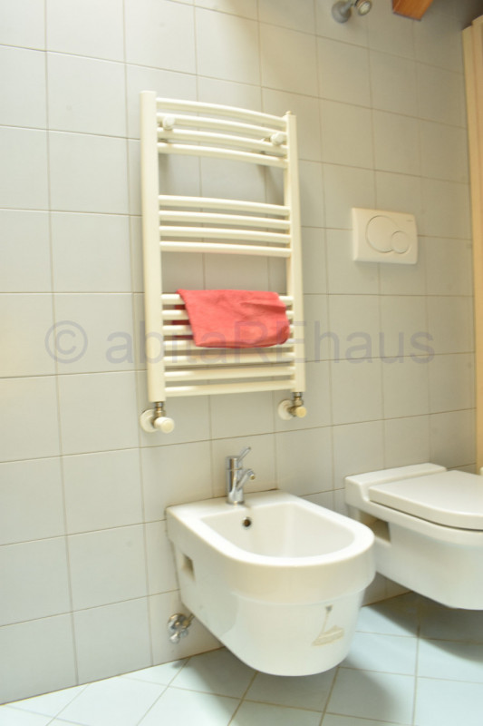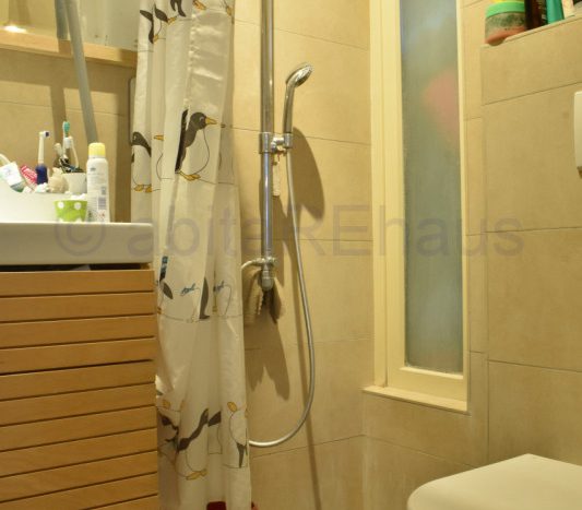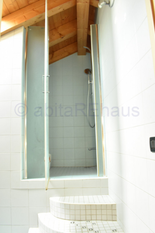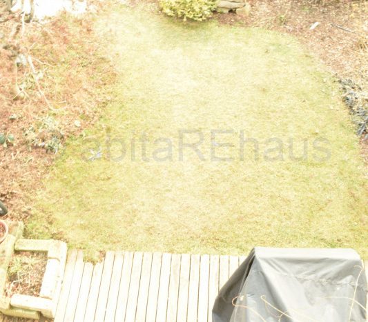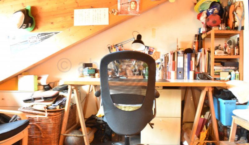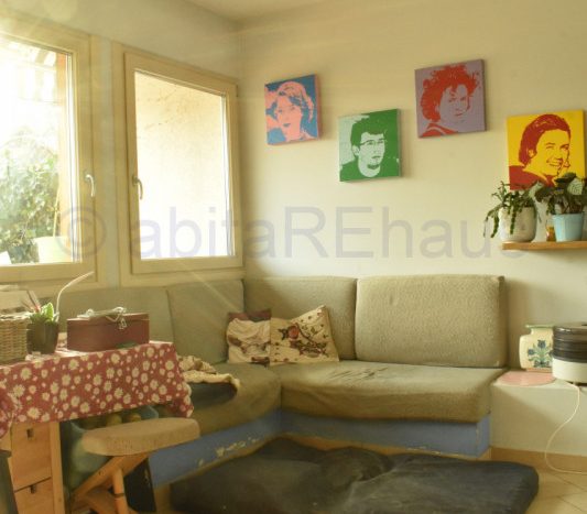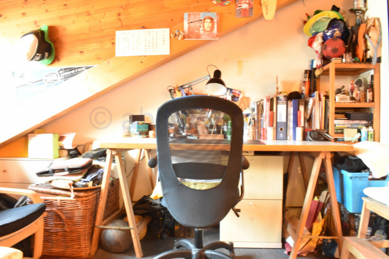 Im Obergeschoss befinden sich ein Schlafzimmer mit eigenem Bad, ein zweites Schlafzimmer mit Südbalkon – das derzeit als zweites Wohnzimmer genutzt wird – und die Treppe zum zweiten Stock, wo sich zwei weitere große Hobbyräume und ein drittes Badezimmer befinden.