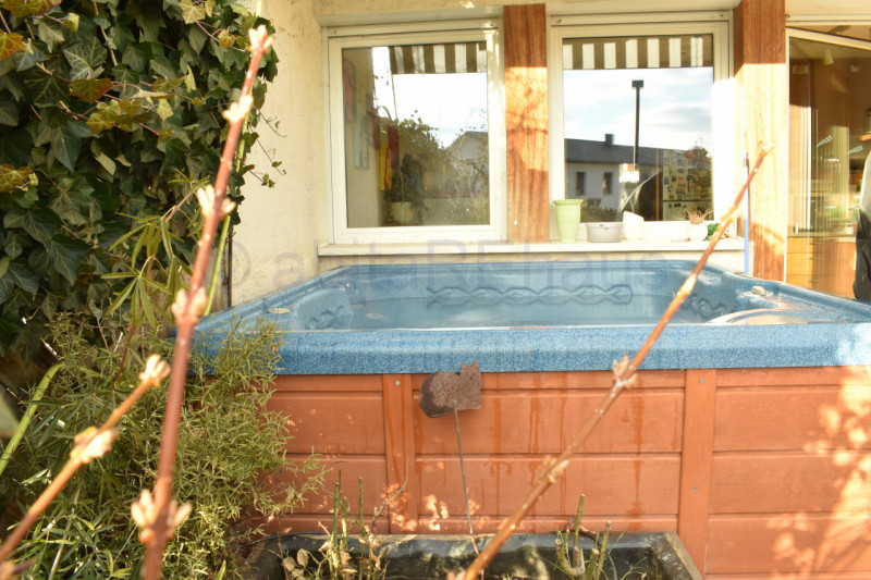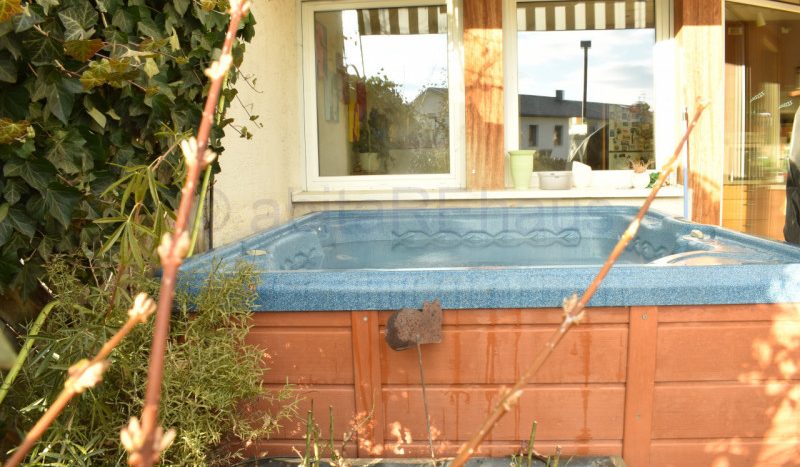 Der Außenbereich: Ein gepflegter Garten mit einem Teich, umgeben von alten Hecken, garantiert absolute Privatsphäre. Außerdem befindet sich hier ein moderner beheizter Whirlpool, der sich das ganze Jahr über perfekt für exklusive Momente im Freien eignet.