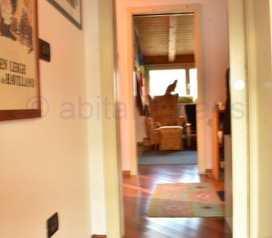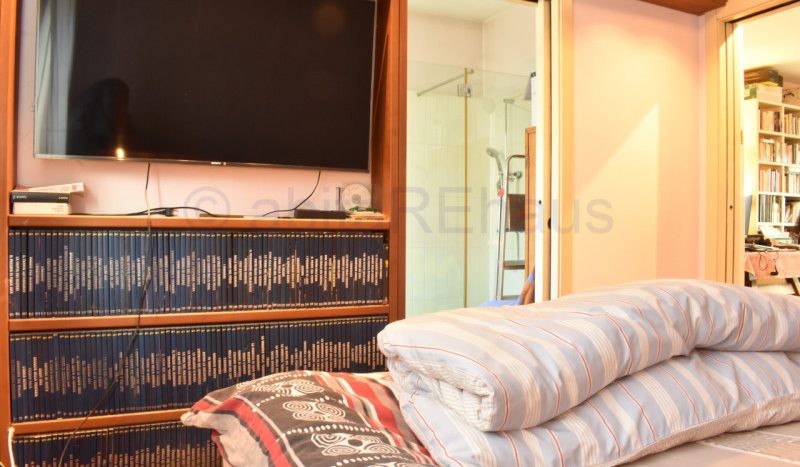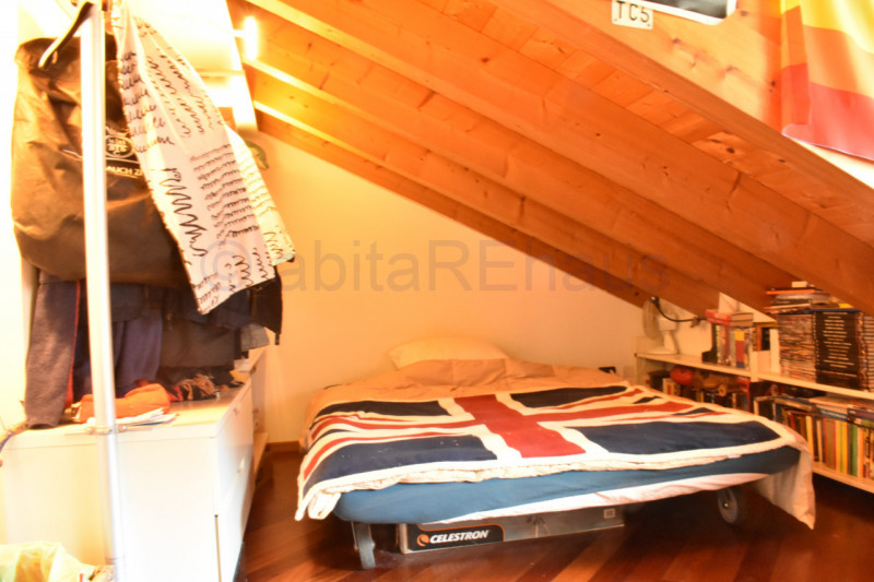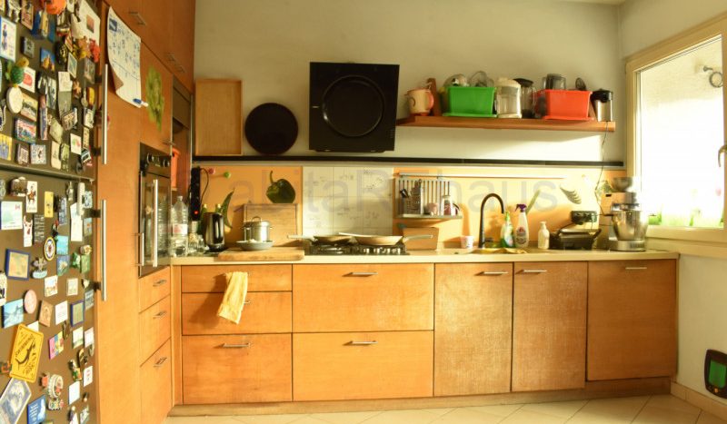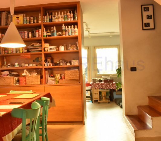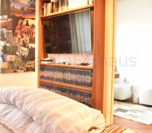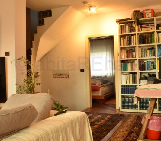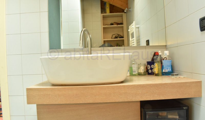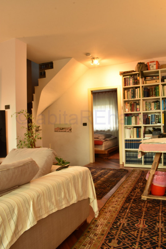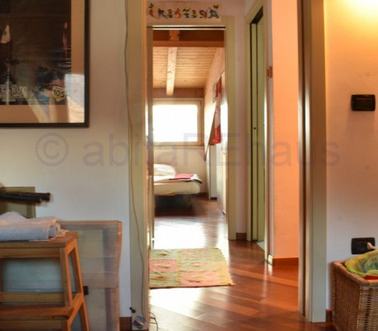 L’abitazione offre ambienti ampi e luminosi: la zona giorno presenta una cucina abitabile accogliente ed un living con grande libreria su misura, un guardaroba di ingresso ed un bagno. Da qui le scale ai