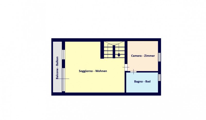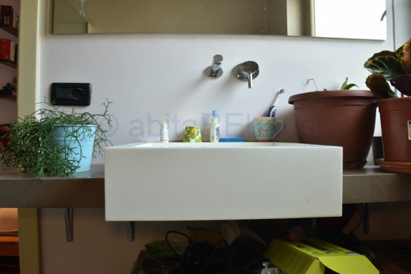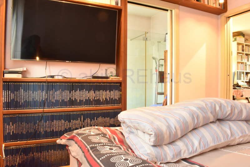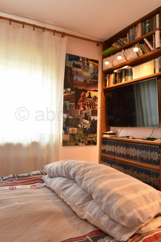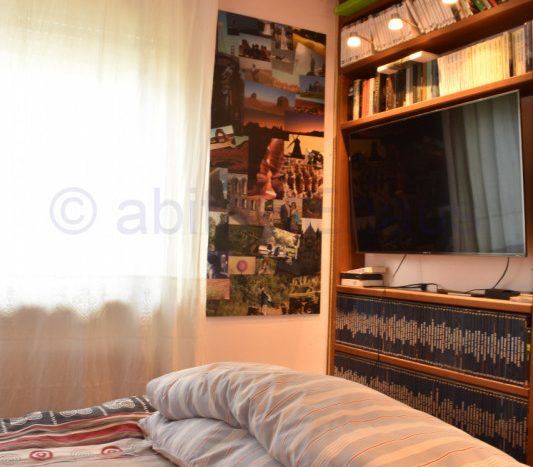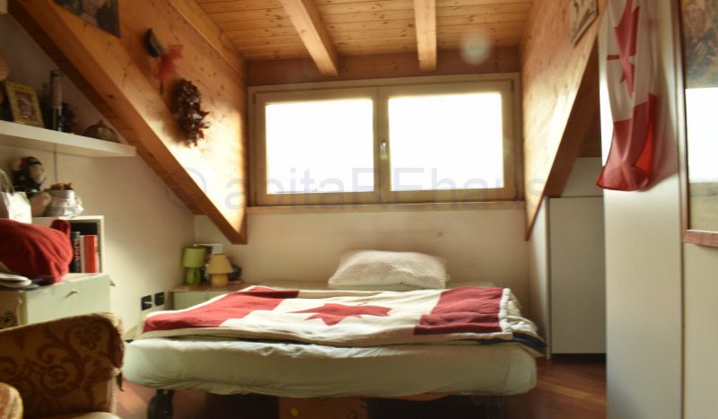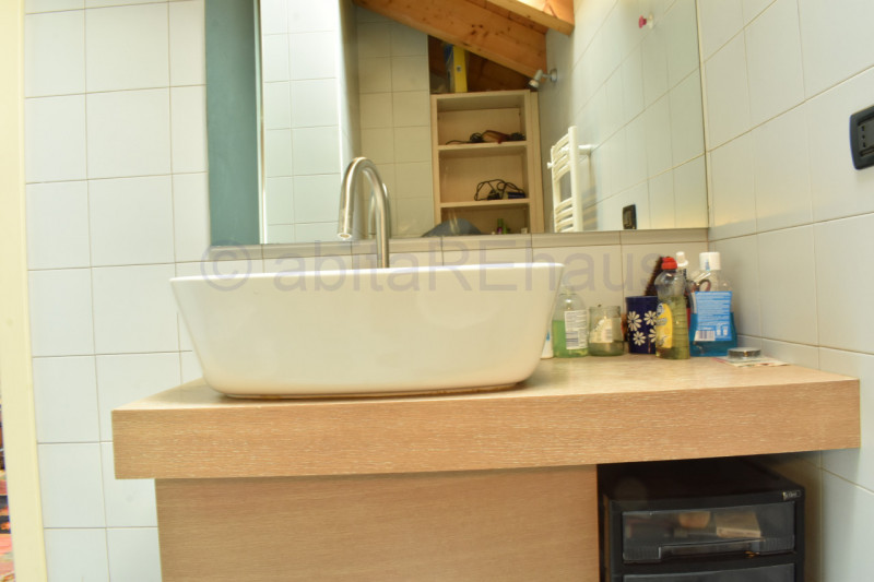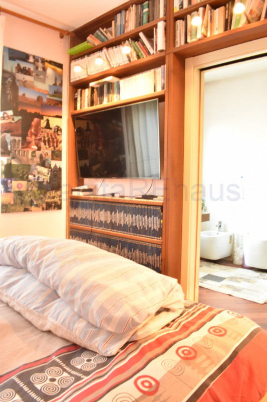 L’abitazione offre ambienti ampi e luminosi: la zona giorno presenta una cucina abitabile accogliente ed un living con grande libreria su misura, un guardaroba di ingresso ed un bagno. Da qui le scale ai